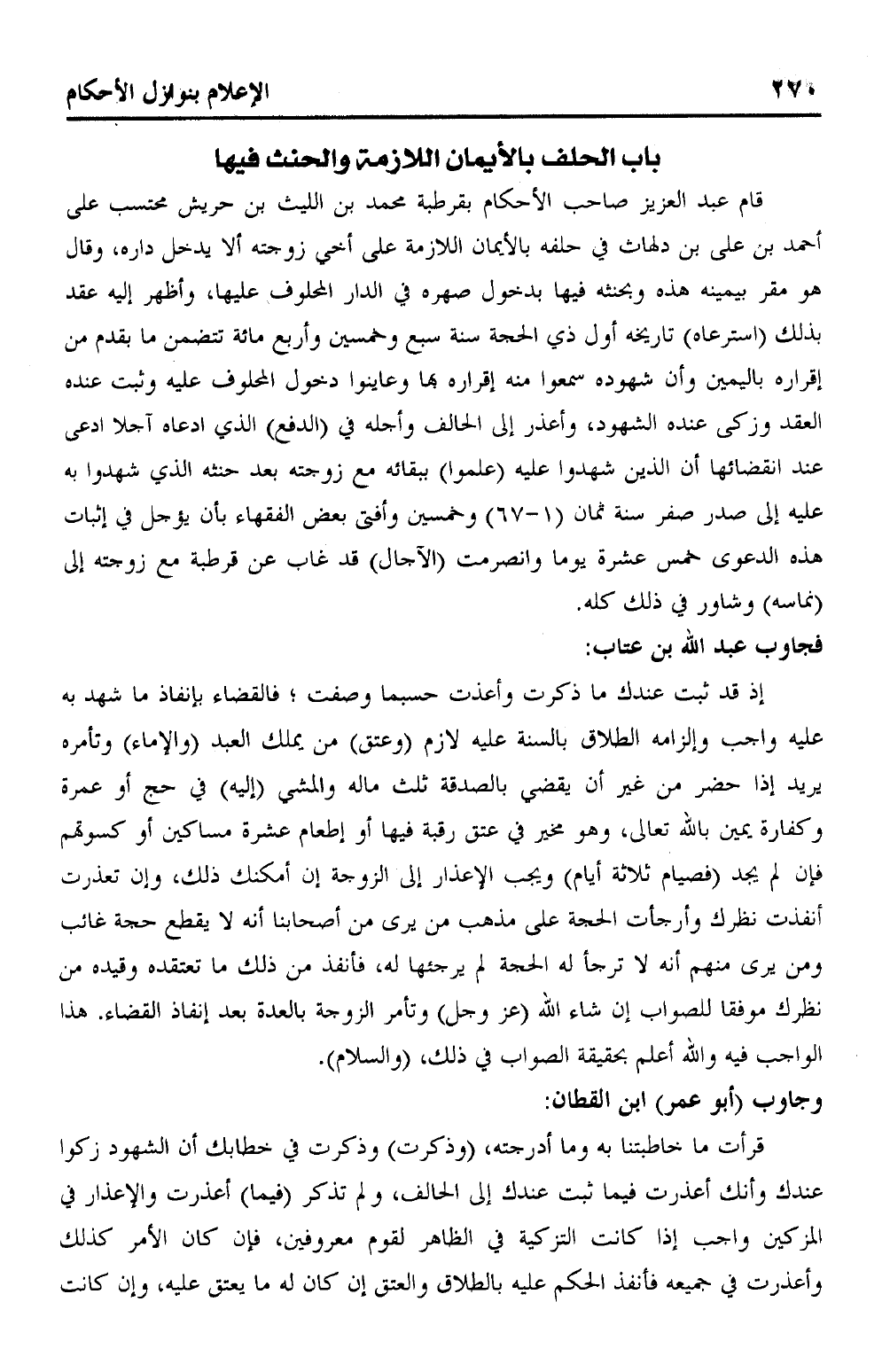 قام عبد العزيز صاحب الأحكام بقرطبة محمد بن الليث بن حريش محتسب على أحمد بن علي بن دلهاث في حلفه بالأيمان اللازمة على أخي زوجته ألا يدخل داره، وقال هو مقر بيمينه هذه وبحنثه فيها بدخول صهره في الدار المحلوف عليها، وأظهر إليه عقد بذلك (استرعاه) تاريخه أول ذي الحجة سنة سبع وخمسين وأربع مائة تتضمن ما يقدم من إقراره باليمين وأن شهوده سمعوا منه إقراره بها وعاينوا دخول المحلوف عليه وثبت عنده العقد وزكى عنده الشهود، وأعذر إلى الحالف وأجله في (الدفع) الذي ادعاه آجلا ادعى عند انقضائها أن الذين شهدوا عليه (علموا) ببقائه مع زوجته بعد حنثه الذي شهدوا به عليه إلى صدر صفر سنة ثمان (1 - 67) وخمسين وأفتى بعض الفقهاء بأن يؤجل في إثبات هذه الدعوى خمس عشرة يوما وانصرمت (الآجال) قد غاب عن قرطبة مع زوجته إلى (نماسه) وشاور في ذلك كله.