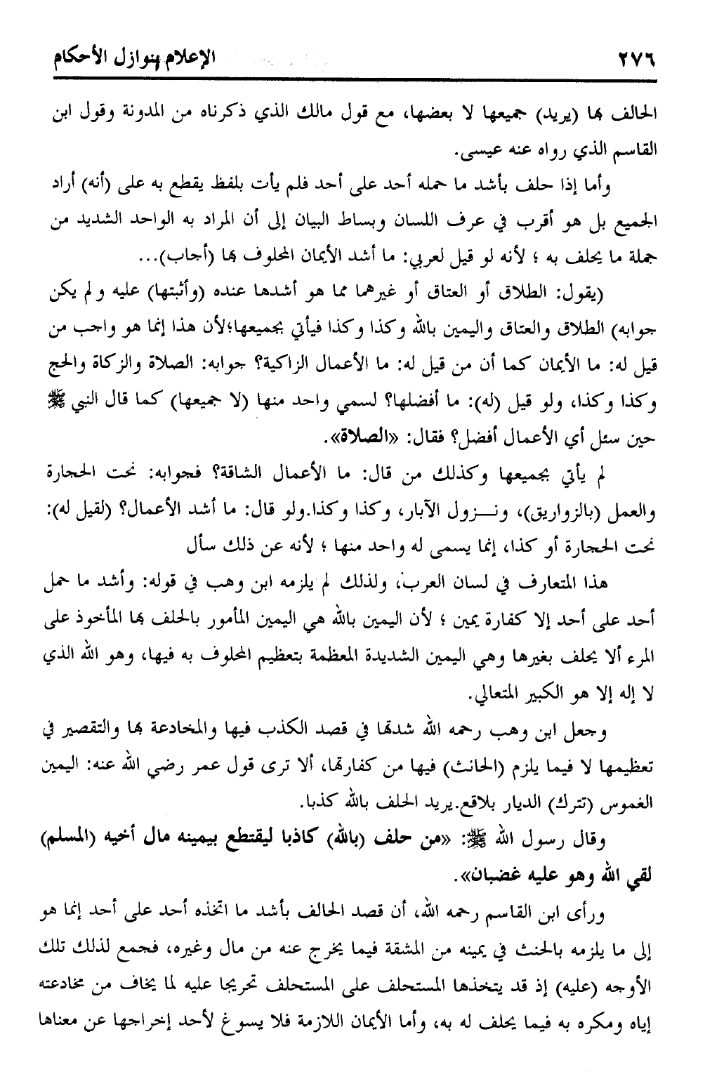 (يقول: الطلاق أو العتاق أو غيرهما مما هو أشدها عنده (وأثبتها) عليه ولم يكن جوابه) الطلاق والعتاق واليمين بالله وكذا وكذا فيأتي بجميعها؛ لأن هذا إنما هو واجب من قيل له: ما الأيمان كما أن من قيل له: ما الأعمال الزاكية؟ جوابه: الصلاة والزكاة والحج وكذا وكذا، ولو قيل (له): ما أفضلها؟ لسمي واحد منها (لا جميعها) كما قال النبي صلى الله عليه وسلم حين سئل أي الأعمال أفضل؟ فقال: "الصلاة".