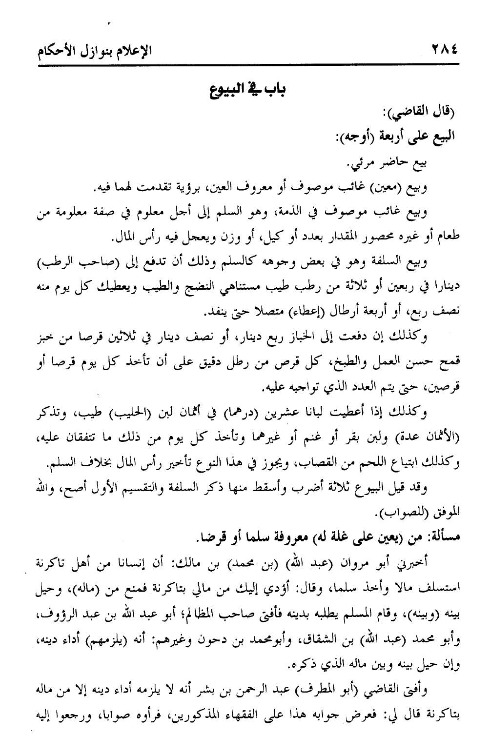 وبيع غائب موصوف في الذمة، وهو السلم إلى أجل معلوم في صفة معلومة من طعام أو غيره محصور المقدار بعدد أو كيل، أو وزن ويعجل فيه رأس المال.