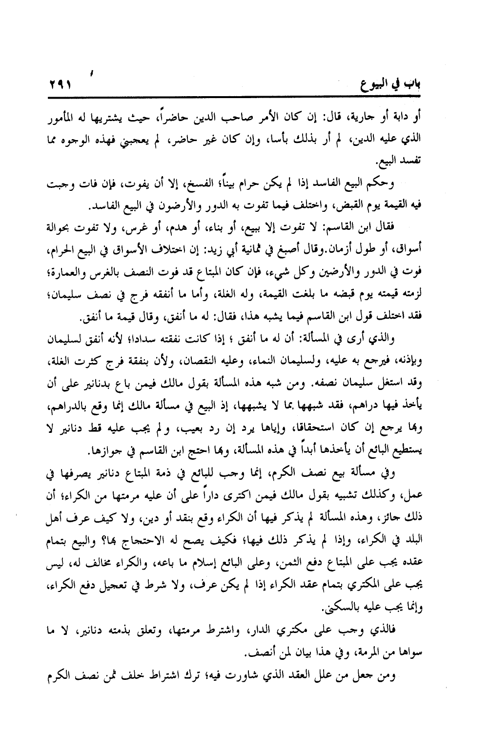 وفي مسألة بيع نصف الكرم، إنما وجب للبائع في ذمة المبتاع دنانير يصرفها في عمل، وكذلك تشبيه بقول مالك فيمن اكترى دارًا على أن عليه مرمتها من الكراء، أن ذلك جائز، وهذه المسألة لم يذكر فيها أن الكراء وقع بنقد أو دين، ولا يكف عرف أهل البلد في الكراء، وإذا لم يذكر ذلك فيها؛ فكيف يصح له الاحتجاج بها؟ والبيع بتمام عقده يجب على المبتاع دفع الثمن، وعلى البائع إسلام ما باعه، والكراء مخالف له، ليس يجب على المكتري بتمام عقد الكراء إذا لم يكن عرف، ولا شرط في تعجيل دفع الكراء، وإنما يجب عليه بالسكنى.