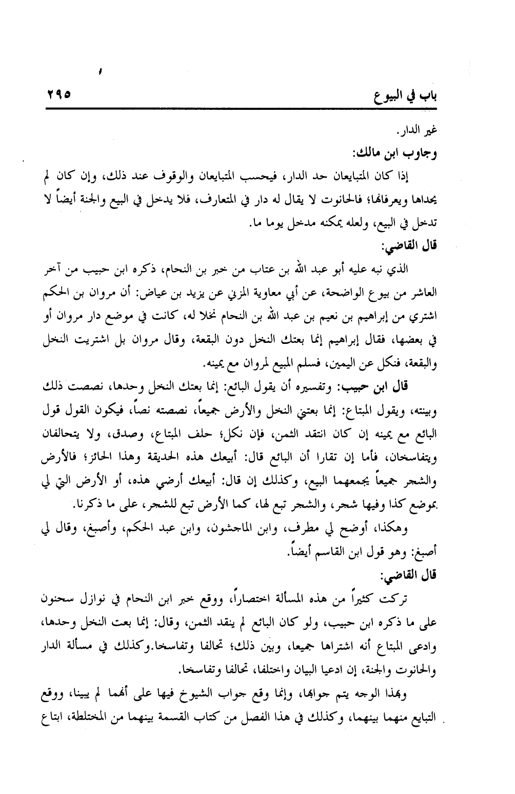 تركت كثيرًا من هذه المسألة اختصارًا، ووقع خبر ابن النحام في نوازل سحنون على ما ذكره ابن حبيب، ولو كان البائع لم ينقد الثمن، وقال: إنما بعت النخل وحدها، وادعى المبتاع أنه اشتراها جميعًا، وبين ذلك؛ تحالفًا وتفاسخا. وكذلك في مسألة الدار والحانوت والجنة، إن ادعيا البيان واختلفا، تحالفا وتفاسخًا.