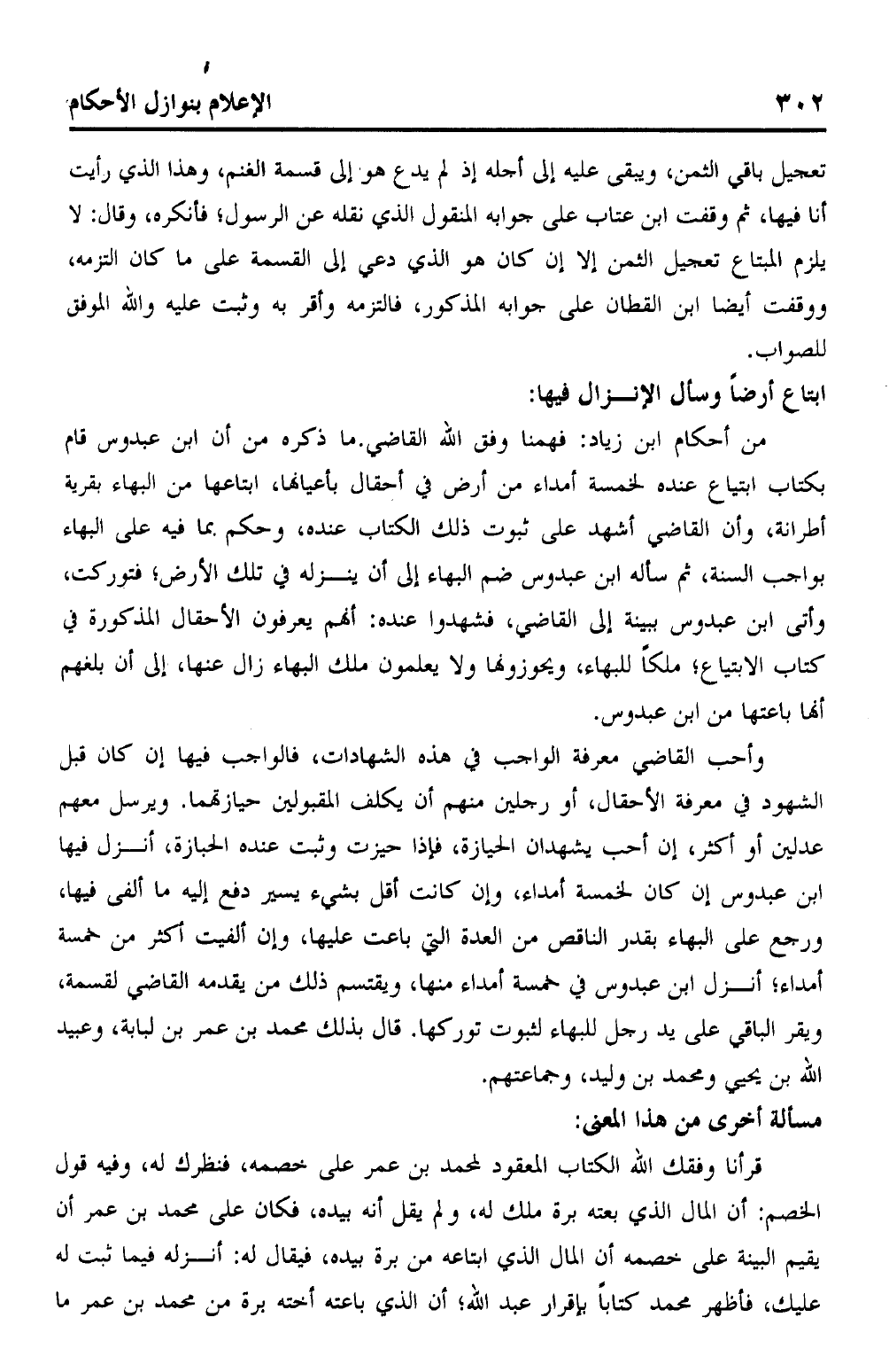 من أحكام ابن زياد: فهمنا وفق الله القاضي. ما ذكره من أن ابن عبدوس قام بكتاب ابتياع عنده لخمسة أمداء من أرض في أحقال بأعيانها، ابتاعها من البهاء بقرية أطرانة، وأن القاضي أشهد على ثبوت ذلك الكتاب عنده، وحكم بما فيه على البهاء بواجب السنة، ثم سأله ابن عبدوس ضم البهاء إلى أن ينزله في تلك الأرض؛ فتكوركت، وأتى ابن عبدوس ببينة إلى القاضي، فشهدوا عنده: أنهم يعرفون الأحقال المذكورة في كتاب الابتياع؛ لملكًا للبهاء، ويحوزونها ولا يعلمون ملك البهاء زال عنها، إلا أن بلغهم أنها باعتها من ابن عبدوس.