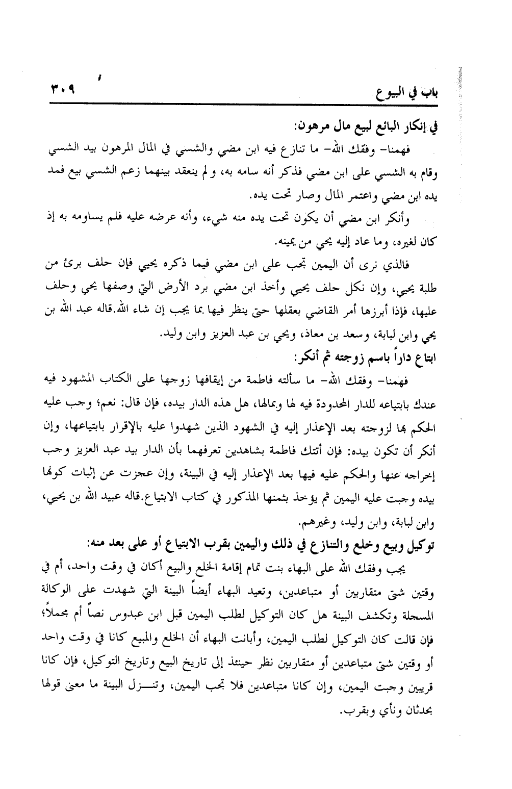 فهمنا-وفقك الله- ما تنازع فيه ابن مضي والشسي في المال المرهون بيد الشسي وقام به الشسي على ابن مضي فذكر أنه سامه به، ولم ينعقد بينهما زعم الشسي بيع فمد يده ابن مضي واعتمر المال وصار تحت يده.