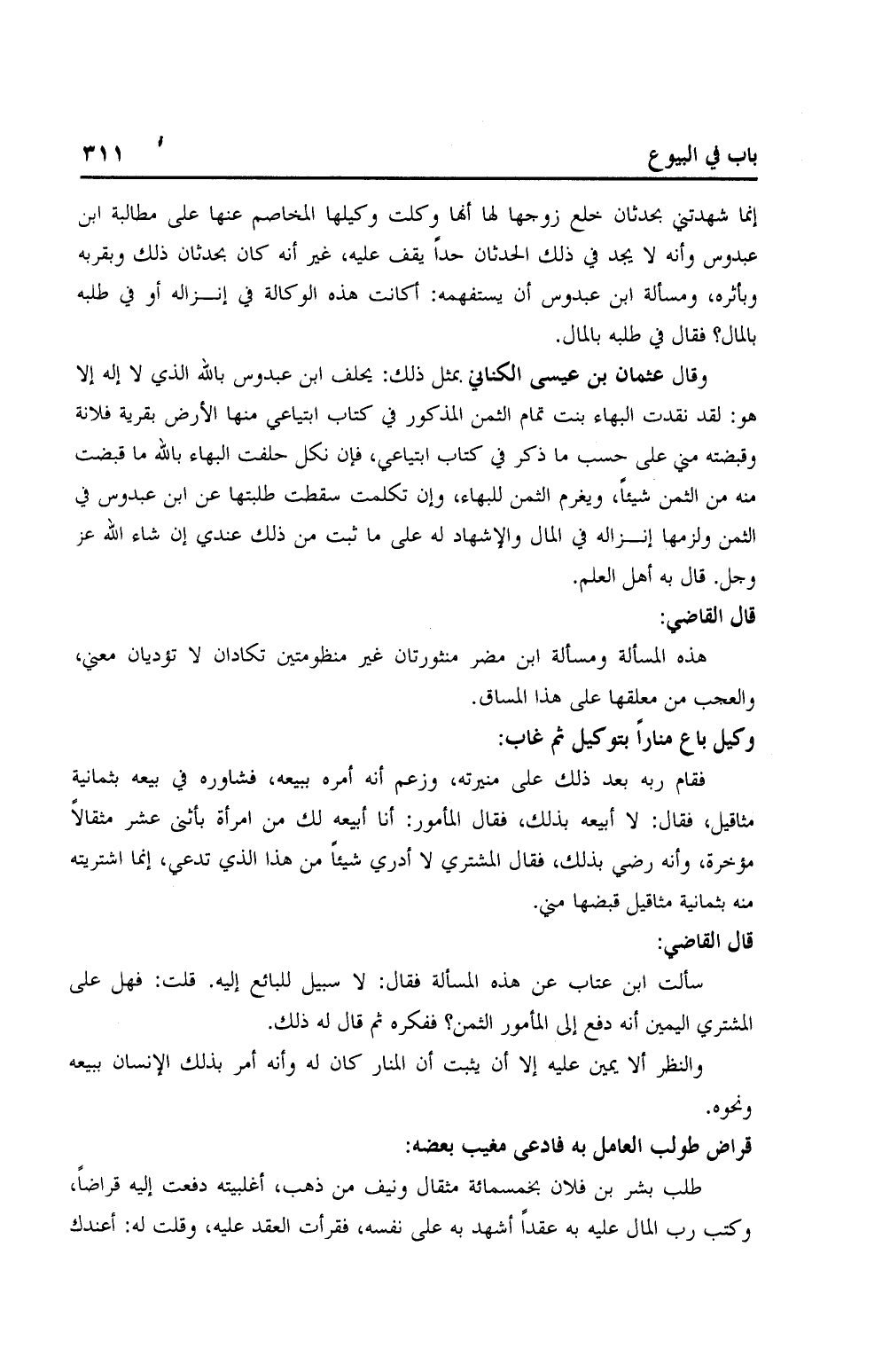 وقال عثمان بن عيسى الكتاني بمثل ذلك: يحلف ابن عبدوس بالله الذي لا إله إلا هو: لقد نقدت البهاء بنت تمام الثمن المذكور في كتاب ابتياعي منها الأرض بقرية فلانه وقبضته مني على حسب ما ذكر في كتاب ابتياعي، فإن نكل حلفت البهاء بالله ما قبضت منه من الثمن شيئًا، ويغرم الثمن للبهاء، وإن تكلمت سقطت طلبتها عن ابن عبدوس في الثمن ولزمها إنزاله في المال والاشهاد له على ما ثبت من ذلك عندي إن شاء الله عز وجل. قال به أهل العلم.