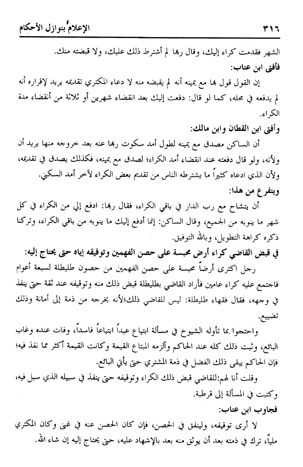 رجل اكترى أرضًا محبسة على حصن الفهمين من حصول طليطلة لسبعة أعوام فأجتمع عليه كراء عامين فأارد القاضي بطليطلة قبض ذلك منه وتوقيفه عندثقة حتى ينفذ في وجهه، فقال فقهاء طليطلة: ليس للقاضي ذلك؛ لأنه يخرجه من ذمة إلى أمانة وذلك تضييع.