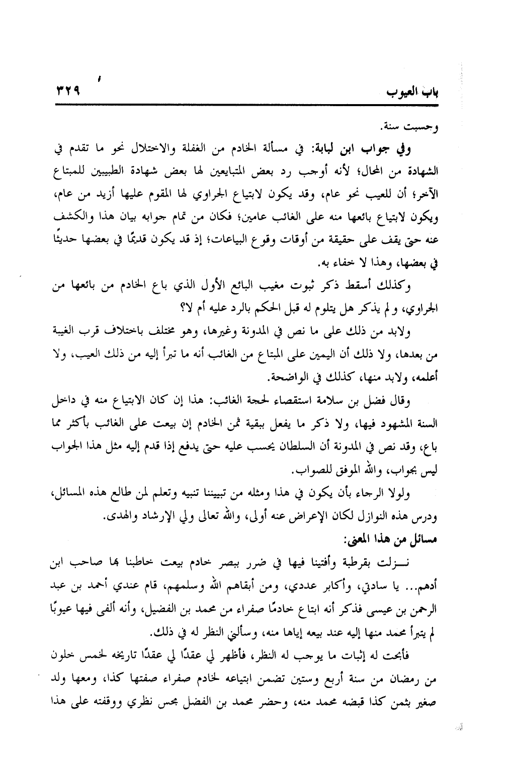 وفي جواب ابن لبابة: في مسألة الخادم من الغفلة والاختلال نحو ما تقدم في الشهادة من المحال؛ لأنه أوجب رد بعض المبايعين لها بعض شهادة الطبيبين للمبتاع الآخر؛ أن للعيب نحو عام، وقد يكون لابتياع الجراوي لها المقوم عليها أزيد من عام، ويكون لابتياع بائعها منه على الغائب عامين؛ فكان من تمام جوابه بيان هذا والكشف عنه حتى يقف على حقيقة من أوقات وقوع البياعات؛ إذ قد يكون قديمًا في بعضها حديثًا في بعضها، وهذا لا خفاء به.