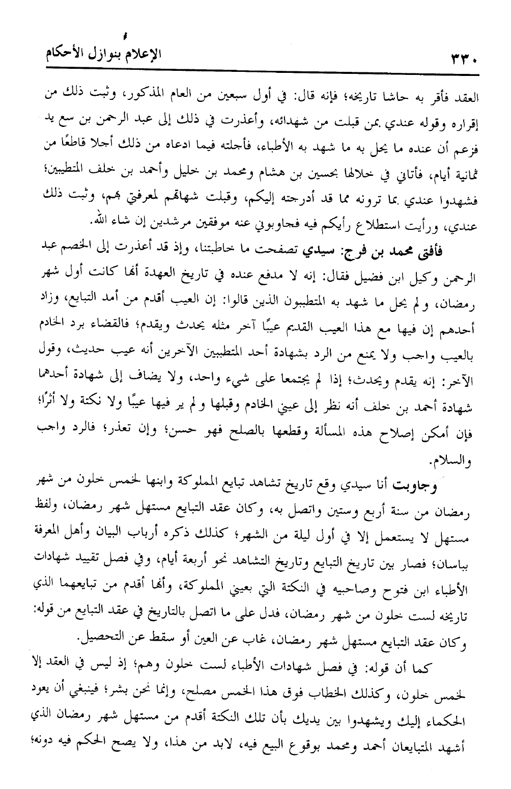 وجاوبت أنا سيد وقع تاريخ تشاهد تبايع المملوكة وابنها لخمس خلون من شهر رمضان من سنة أربع وستين واتصل به، وكان عقد التبايع مستهل شهر رمضان، ولفظ مستهل لا يستعمل إلا في أول ليلة من الشهر؛ كذلك ذكره أرباب البيان وأهل المعرفة بباسان؛ فصار بين تاريخ التبايع وتاريخ التشاهد نحو أربعة أيام، وفي فصل تقييد شهادات الأطباء ابن فتوح وصاحبيه في النكتة التي بعيني المملوكة، وأنها أقدم من تبايعهما الذي تاريخه لست خلون من شهر رمضان، فدل على ما اتصل بالتاريخ في عقد التبايع من قوله: وكان عقد التبايع مستهل شهر رمضان، غاب عن العين أو سقط عن التحصيل.