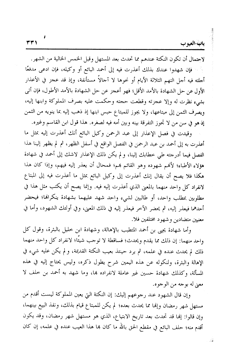 وقيدت في فصل الإعذار إلى عبد الرحمن وكيل البائع أنك أعذرت إليه بمثل ما أعذرت به إلى أحمد بن عبد الرحمن في الفصل الواقع في أسفل الظهر، ثم لم يظهر إلينا هذا الفصل فيما أدرجته طي خطابك إلينا، ولم يكن ذلك الإعذار لاشك إلى أحمد في شهادة هؤلاء الأطباء؛ لأنهم شهوده وهو القائم بهم؛ فمحال أن يعذر إليه فيهم، وإذا كان هذا هكذا فلا يصح أن يقال إنك أعذرت إلى وكيل البائع بمثل ما أعذرت فيه إلى المبتاع لانفراد كل واحد منهما بالمعنى الذي أعذرت إليه فيه. وإنما يصح أن يكتب مثل هذا في مطلوبين بمطلب واحد، أو طالبين لشيء واحد شهد عليهما بشهادة ينكرانها؛ فيحضر أحدهما فيعذر إليه، ثم يحضر الآخر فيعذر إليه في ذلك المعنى، وفي أولئك الشهود، وأما في معنيين متضادين وشهود مختلفين فلا.