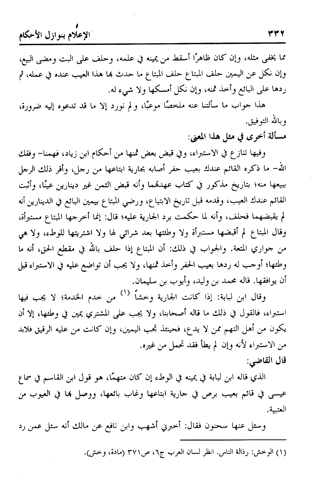 وفيها تنازع في الاستبراء، وفي قبض بعض ثمنها من أحكام ابن زياد، فهمنا - وفقك الله - ما ذكره القائم عندك بعيب حفر أصابه بجارية ابتاعها من رجل، واقر ذلك الرجل ببيعها منه؛ بتاريخ مذكور في كتاب عهدتهما وأنه قبض الثمن غير دينارين عينًا، وأثبت القائم عندك العيب، وقدمه قبل تاريخ الابتياع، ورضي المبتاع بيمين البائع في الدينارين أنه لم يقبضهما فحلف، وأنه لما حكمت برد الجارية عليه؛ قال: إنما أخرجها المبتاع مستبرأة، وقال المبتاع لم اقضها مستبرأة ولا وطئتها بعد شرائي لها ولا اشتريتها للوطء، ولا هي من جواري المتعة. والجواب في ذلك/ أن المبتاع إذا حلف بالله في مقطع الحق، أنه ما وطئها؛ أوجب له ردها بعيب الحفر وأخذ ثمنها، ولا يجب أن تواضع عليه في الاستبراء قبل أن يوافقها. قاله محمد بن وليد، وأيوب بن سليمان.
