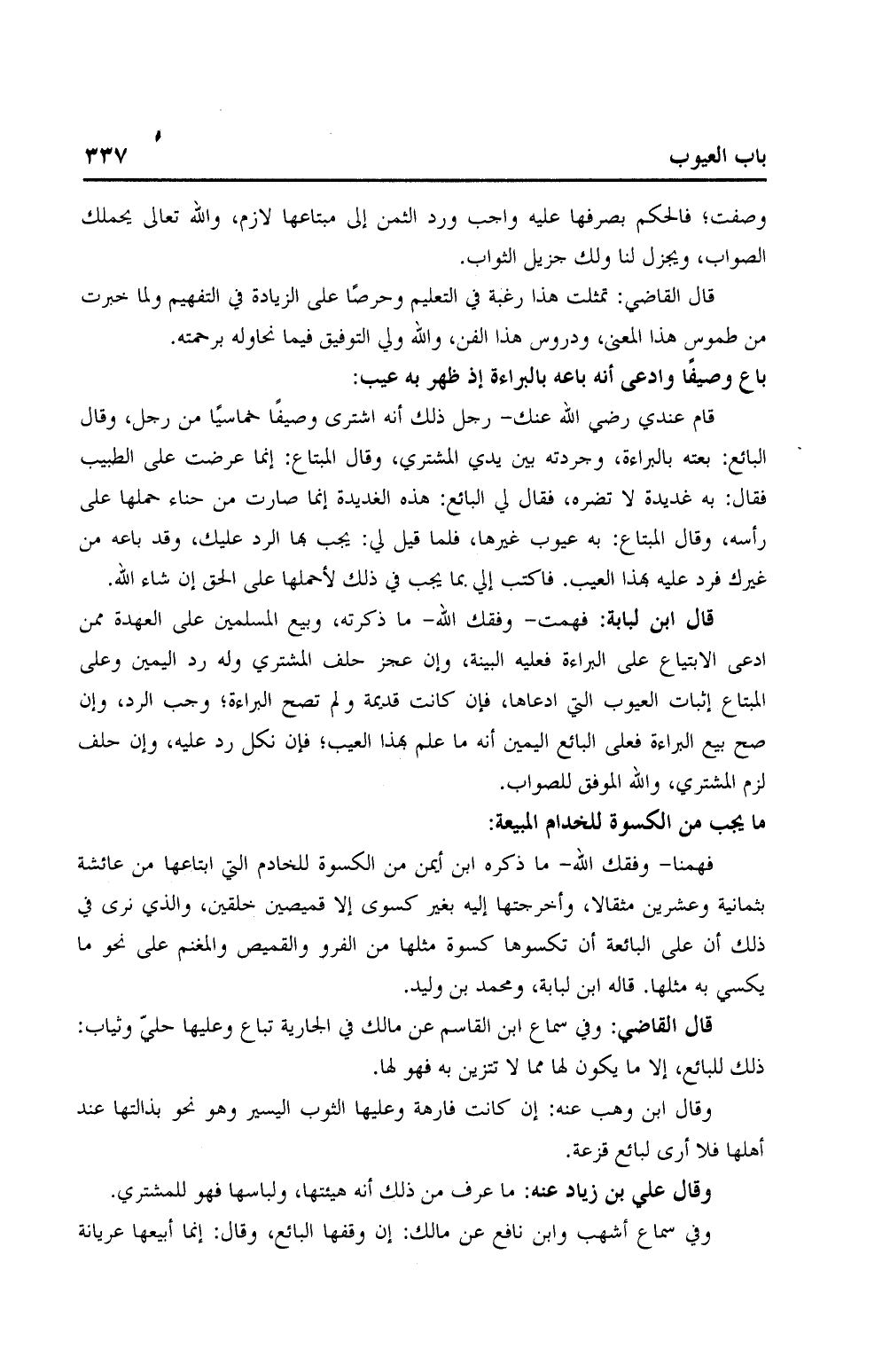 قام عندي رضي الله عنك - رجل ذلك أنه اشترى وصيفًا خماسيًا من رجل، وقال البائع: بعته بالبراءة، وجردته بين يدي المشتري، وقال المبتاع: إنما عرضت على الطبيب فقال: به غديدة لا تضره، فقال لي البائع: هذه الغديدة إنما صارت من حناء حملها على رأسه، وقال المبتاع: به عيوب غيرها، فملا قيل لي يجب بها الرد عليك، وقد باعه من غيرك فرد عليه بهذا العيب. فاكتب إلي بما يجب في ذلك لأحملها على الحق إن شاء الله.