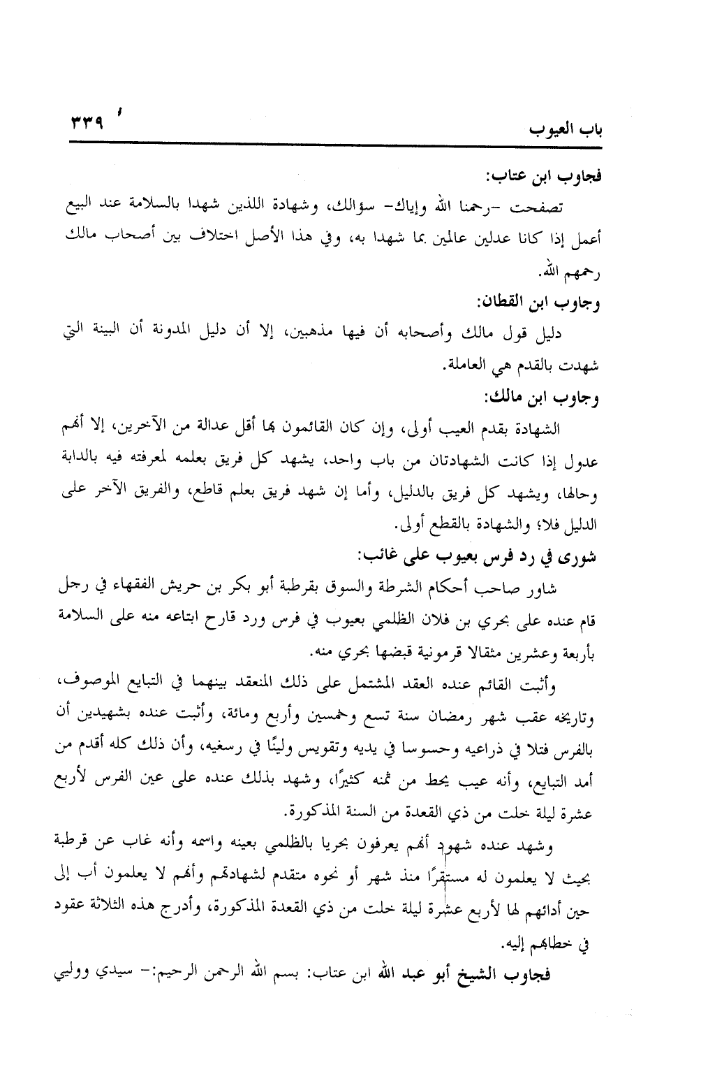 وأثبت القائم عنده العقد المشتمل على ذلك المنعقد بينهما في التبايع الموصوف، وتاريخه عقب شهر رمضان سنة تسع وخمسين وأربع ومائة، وأثبت عنده بشهيدين أن بالفرس فتلا في ذراعيه وحسوسا في يديه وتقويس ولينًا في رسغية، وأن ذلك له أقدم من أمد التبايع، وأنه عيب يحط من ثمنه كثيرًا، وشهد بذلك عنده على عين الفرس لأربع عشرة ليلة خلت نم ذي القعدة من السنة المذكورة.