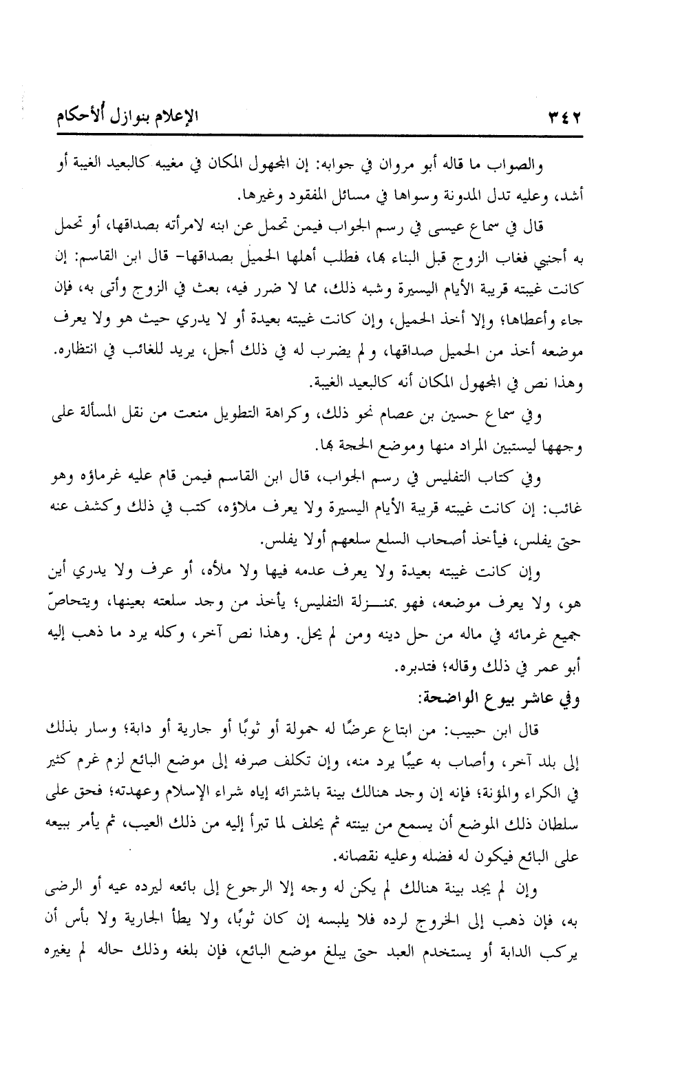 والصواب ما قاله أبو مروان في جوابه: إن المجهول المكان في مغيبه كالبعيد الغيبة أو أشد، وعليه تدل المدونة وسواها في مسائل المفقود وغيرها.