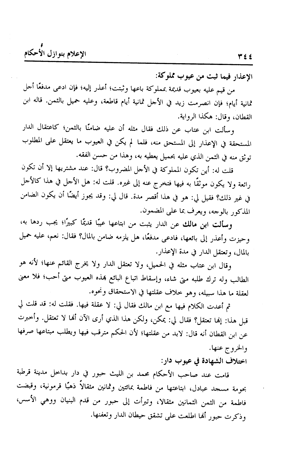 وسألت ابن مالك: عن الدار يثبت من ابتاعها عيبًا قديمًا كبيرًا؛ يجب ردها به، وحيزت وأعذر إلى بائعها، فادعى مدفعًا، هل يلزمه ضامن بالمال؟ فقال: نعم، عليه حميل بالمال، وتعتقل الدار في مدة الإعذار.