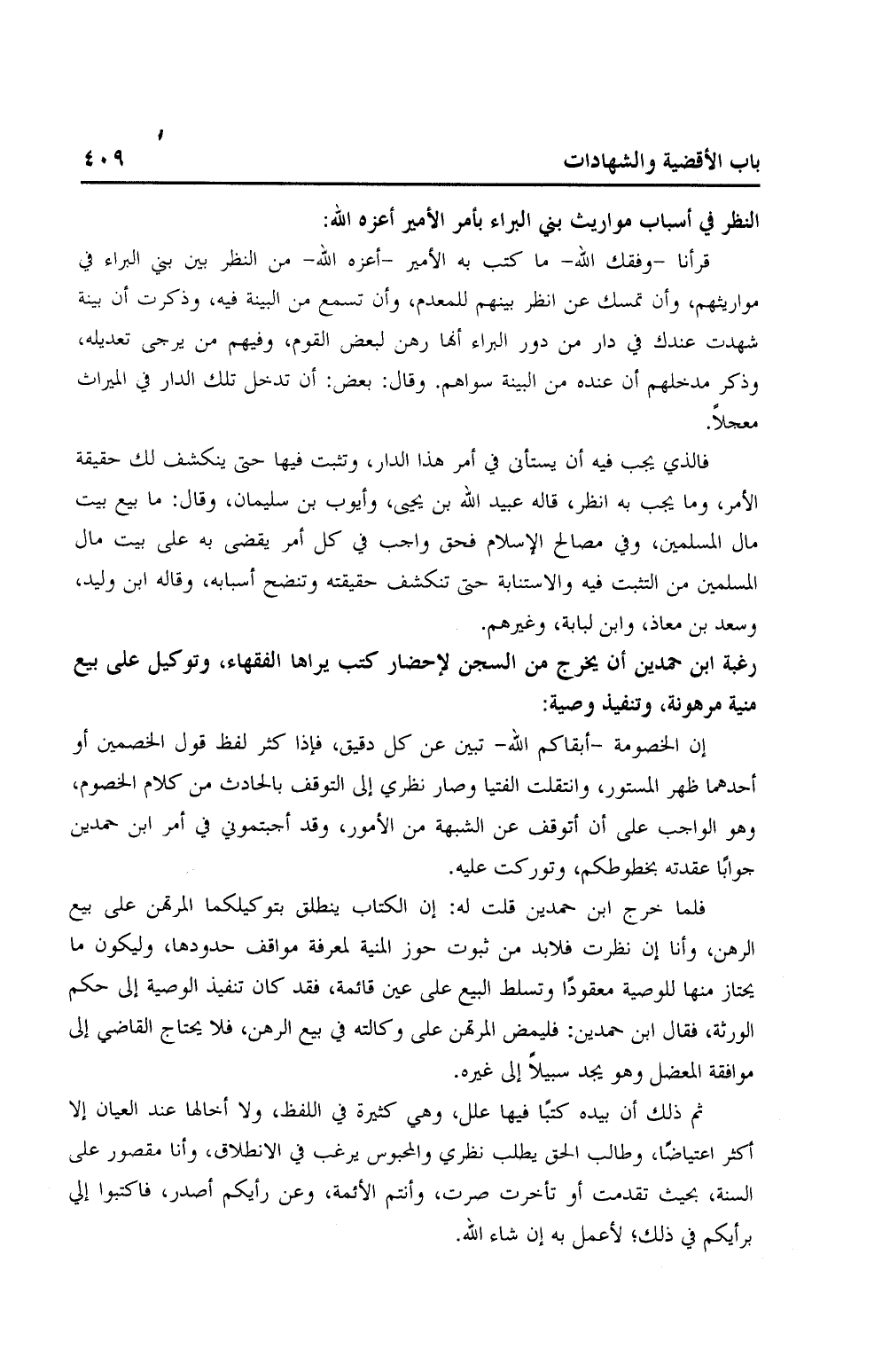 قرأنا – وفقك الله – ما كتب به الأمير – أعزه الله – من النظر بين بني البراء في مواريثهم، وأن تمسك عن انظر بينهم للمعدم، وأن تسمع من البينة فيه، وذكرت أن بينة شهدت عندك في دار من دور البراء أنها رهن لبعض القوم، وفيهم من يرجى تعديله، وذكر مدخلهم أن عنده من البينة سواهم. وقال: بعض: أن تدخل تلك الدار في الميراث معجلاً.