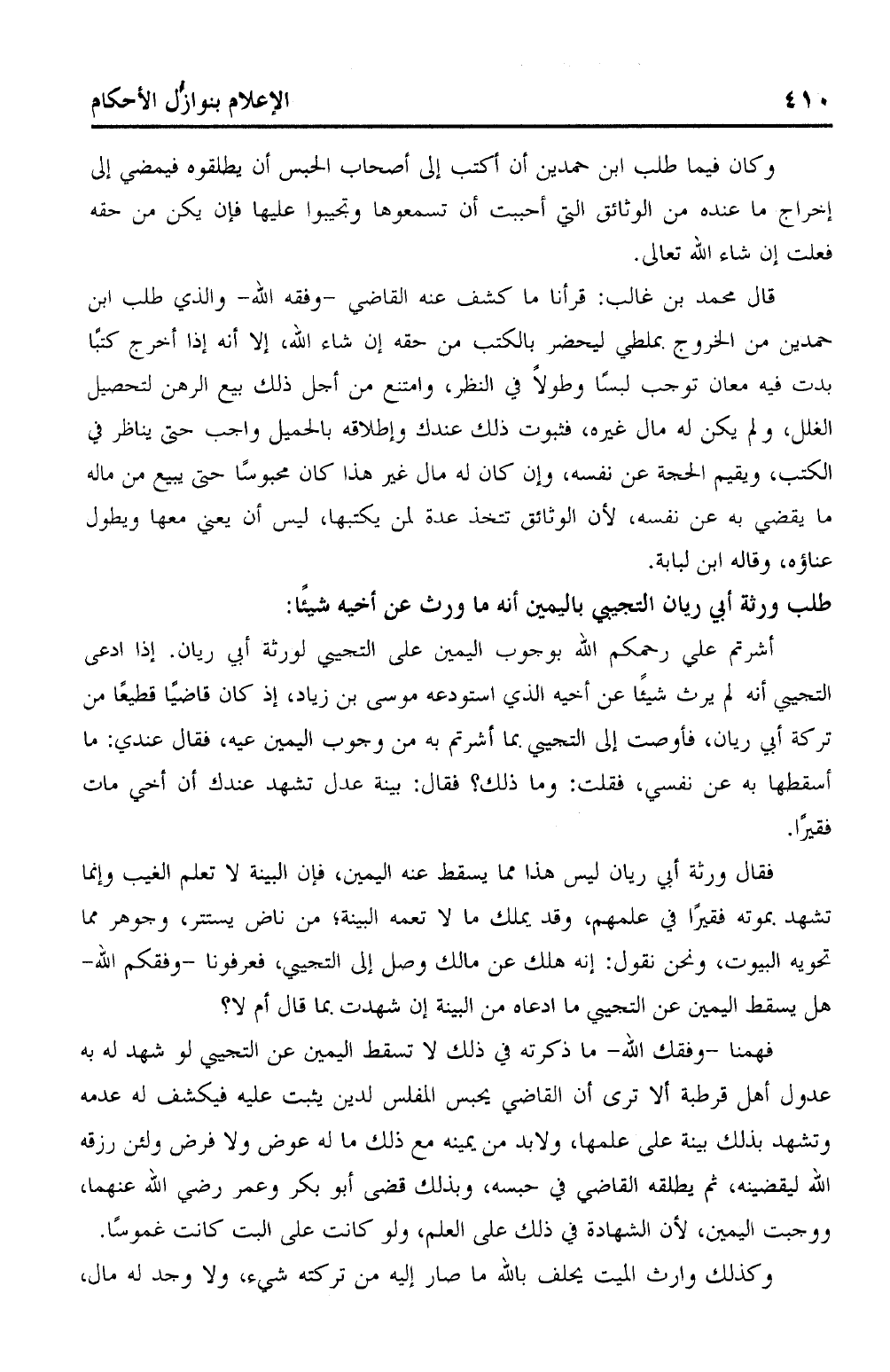 قال محمد بن غالب: قرأنا ما كشف عنه القاضي – وفقه الله – والذي طلب ابن حمدين من الخروج بملطي ليحضر بالكتب من حقه إن شاء الله، إلا أنه إذا أخرج كتبًا بدت فيه معان توجب لبسًا وطولاً في النظر، وامتنع من أجل ذلك بيع الرهن لتحصيل الغلل، ولم يكن له مال غيره، فثبوت ذلك عندك وإطلاقه بالحميل واجب حتى يناظر في الكتب، ويقيم الحجة عن نفسه، وإن كان له مال غير هذا كان محبوسًا حتى يبيع من ماله ما يقضي به عن نفسه، لأن الوثائق تتخذ عدة لمن يكتبها، ليس أن يعني معها ويطول عناؤه، وقاله ابن لبابة.