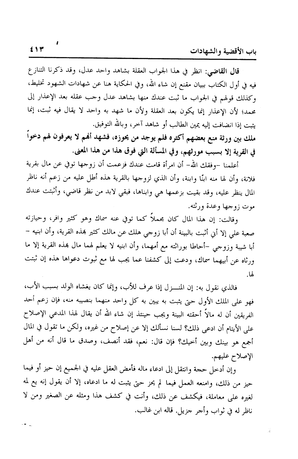 وقلت: إن هذا المال كان مجملاً كما توفي عنه سماك وهو كثير وافر، وحيازته صعبة على إلا أني أثبت بالبينة أن أبا زوجي هلك عن مالك كثير بهذه القرية، وأن ابنية – أبا شيبة وزوجي – أحاطا بوراثته مع أمهما، وأن ابنيه لا يعلم لهما مال بهذه القرية إلا ما ورثاه عن أبيهما سماك، ودعت إلى كشفنا عما يجب لها مع ثبوت دعواها هذه إن ثبتت لها.