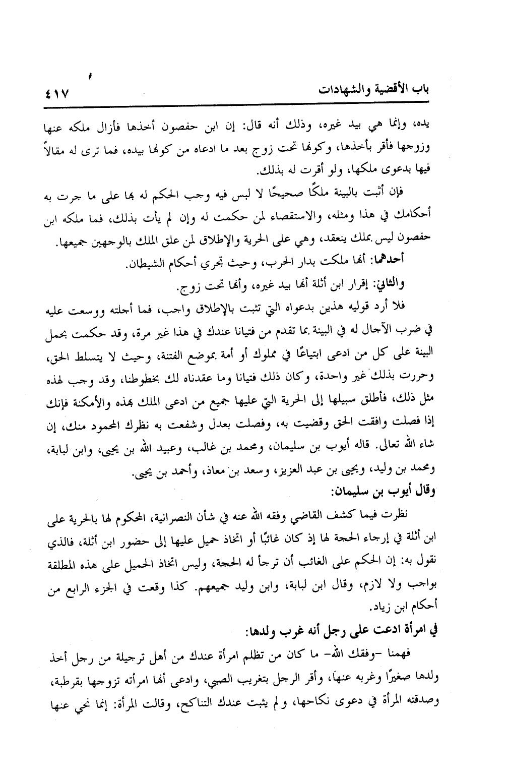 فلا أرد قوليه هذين بدعواه التي تثبت بالإطلاق واجب، فما أجلته ووسعت عليه في ضرب الآجال له في البينة بما تقدم من فتيانا عندك في هذا غير مرة، وقد حكمت بحمل البينة على كل من ادعى ابتياعاًا في مملوك أو أمة بموضع الفتنة، وحيث لا يتسلط الحق، وحررت بذلك غير واحدة، وكان ذلك فتيانا وما عقدنان لك بخطوطنا، وقد وجب لهذه مثل ذلك، فاطلق سبيلها إلى الحرية التي عليها جميع من ادعى الملك بهذه والأمكنة فإنك إذا فصلت وافقت الحق وقضيت به، وفصلت بعدل وشفعت به نظرك المحمود منك، إن شاء الله تعالى. قاله أيوب بن سليمان، ومحمد بن غالب، وعبيد الله بن يحيى، وابن لبابة، ومحمد بن وليد، ويحيى بن عبد العزيز، وسعد بن معاذ، وأحمد بن يحيى.