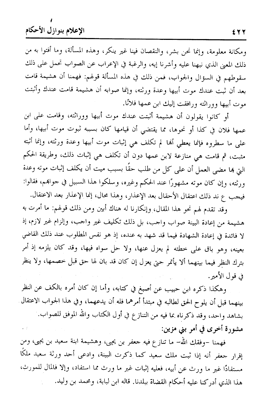 ومكانه معلومة، وإنما نحن بشر، والنقصان فينا غير ينكر، وهذه المسألة، وما أفتوا به من ذلك المعنى الذي نبهنا عليه وأشرنا إليه، والرغبة في الإعراب عن الصواب تحمل على ذلك سقوطهم في السؤال والجواب، فمن ذلك في هذه المسألة قولهم: فهمنا أن هشيمة قامت بعد أن ثبت عندك مموت أبيها وعدة ورثته، وإنما صوابه أن هشيمة قامت عندك وأثبتت موت أبيها ووراثته ورافقت إليك ابن عمها فلانًا.