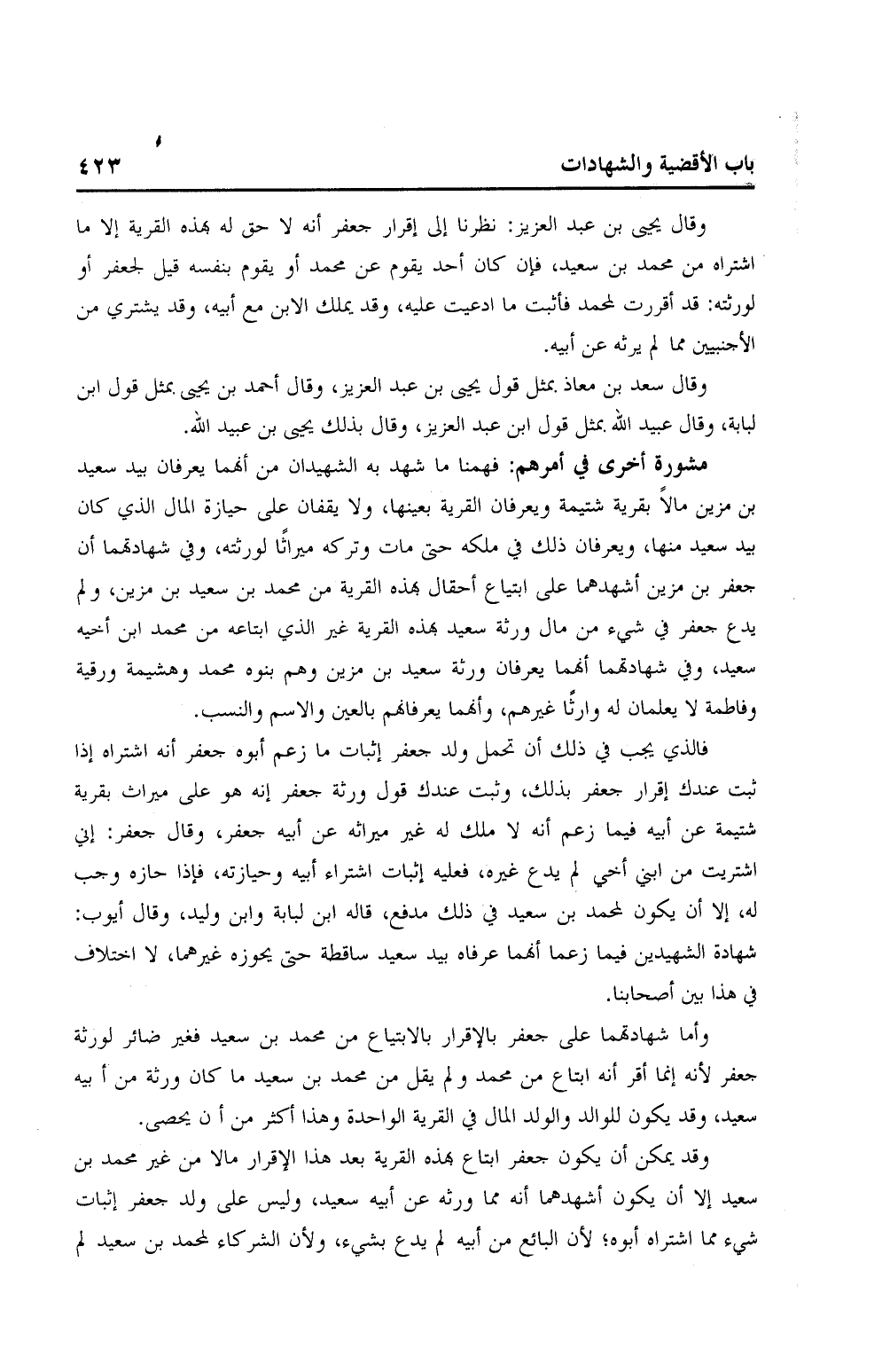 وأما شهادتهما على جعفر بالإقرار بالابتياع من محمد بن سعيد فغير ضائر لورثته جعفر لأنه إنما اقر أنه ابتاع من محمد ولم يقل من محمد بن سعيد ما كان ورثة من أبيه سعيد، وقد يكون للوالد والولد المال في القرية الواحدة وهذا أكثر من أن يحصى.
