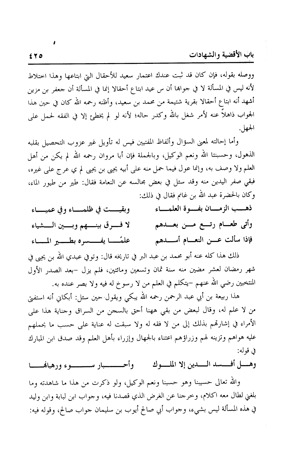 هذا ربيعة بن أبي عبد الرحمن رحمه الله يبكي ويقول حين سئل: أبكاني أنه اتسفتى من لا علم له، وقال لبعض من بقي ههنا أحق بالسجن من السراق وجناية هذا على الأمراء في إشارتهم بذلك إلى من لا فقه له ولا سبقت له عناية على حسب ما يحملهم عليه هواهم وتزينه لهم وزراؤهم اعتناء بالجهال وإزراء بأهل العلم وقد صدق ابن المبارك في قوله: