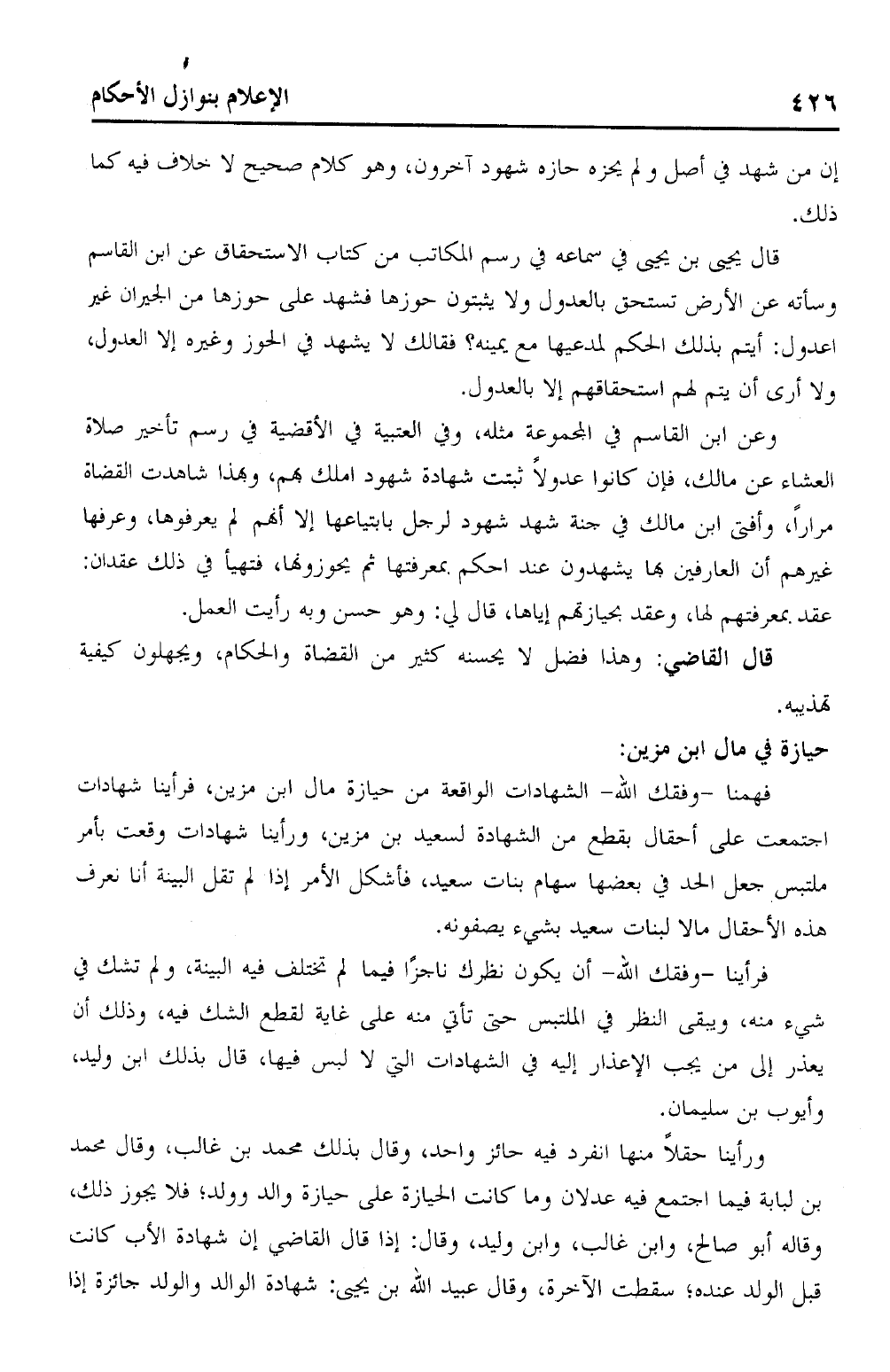 فهمنا – وفقك الله – الشهادات الواقعة من حيازة مال ابن مزين، فرأينا شهادات اجتمعت على أحقال بقطع من الشهادة لسعيد بن مزين، ورأينا شهادات وقعت بأمر ملتبس جعل الحد في بعضها سهام بنات سعيد، فأشكل الأمر إذا لم تقل البينة أنا نعرف هذه الأحقال مالا لبنات سعيد بشيء يصفونه.