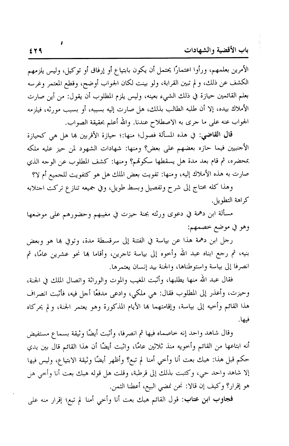 وقال شاهد واحد إنه خاصماه فيها ثمن انصرفا، وأثبت أيضًا وثيقة بسماع مستفيض أنه ابتاعها من القائموأخويه منذ ثلاثين عامًا، وأثبت ايض أن هذا القائم قال بين يدي حكم قبل هذا: هبك بعت أنا وأخي أمنا لم تبعظ وأظهر أيضًا وثيقة الابتياع، وليس فيها إلا شاهد واحد حي، وكتبت بذلك إلى قرطبة، وقلت هل قوله هبك بعت أنا وأخي هل هو إقراظ وكيف إن قالا: نحن نمضي البيع، أعطنا الثمن.