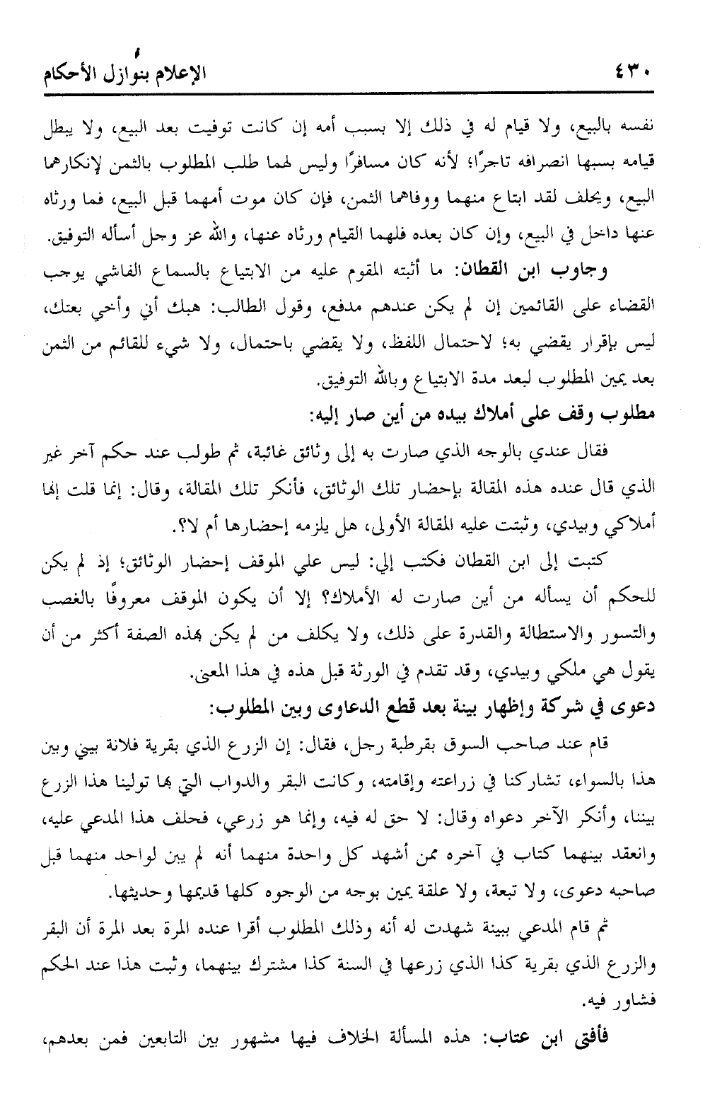 كتبت إلى ابن القطان فكتب إلي: لي على الموقف إحضار الوثائق؛ إذ لم يكن للحكم أن يسأله من أين صارت له الأملاك؟ إلا أن يكون الموقف معروفًا بالغصب والتسور والاستطالة والقدرة على ذلك، ولا يكل من لم يكن بهذه الصفة أكثر من أن يقول هي ملكي وبيد، وقد تقدم في الورثة قبل هذه في هذه المعنى.