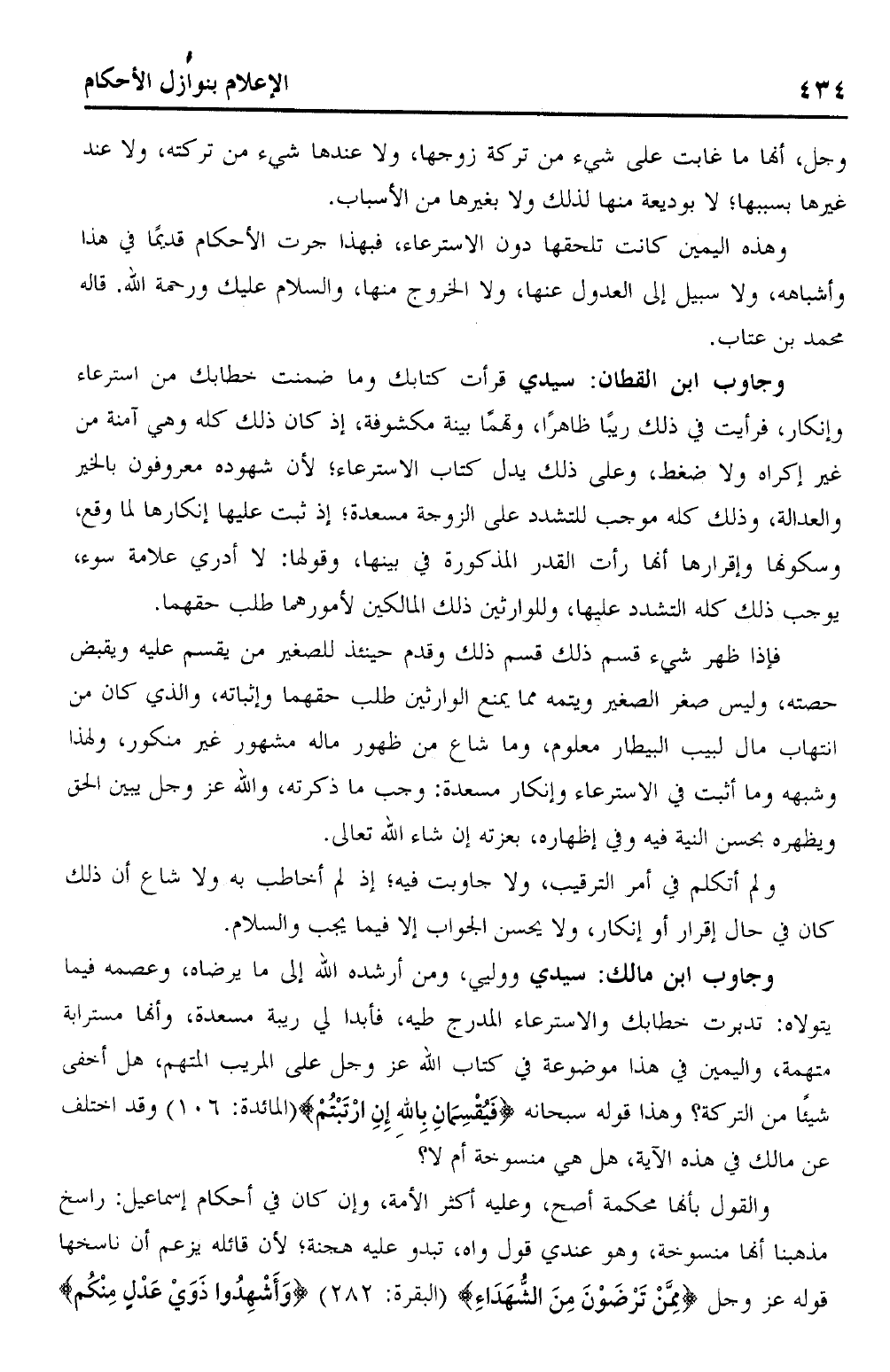وجاوب ابن مالك: سيدي ووليي، ومن أرشده الله إلى ما يرضاه، وعصمه فيما يتولاه: تدبرت خطابك والاسترعاء المدرج طيه، فأبدا لي ريبة مسعدة، وأنها مسترابة متهمة، واليمني في هذا موضوعه في كتاب الله عز وجل على المريب المتهم، هل أخفى شيئًا من التركة؟ وهذا قوله سبحانه {فيقسمان بالله إن ارتبتم} (المائدة: 106) وقد اختلف عن مالك في هذه الآية هل هي منسوخة أم لا؟