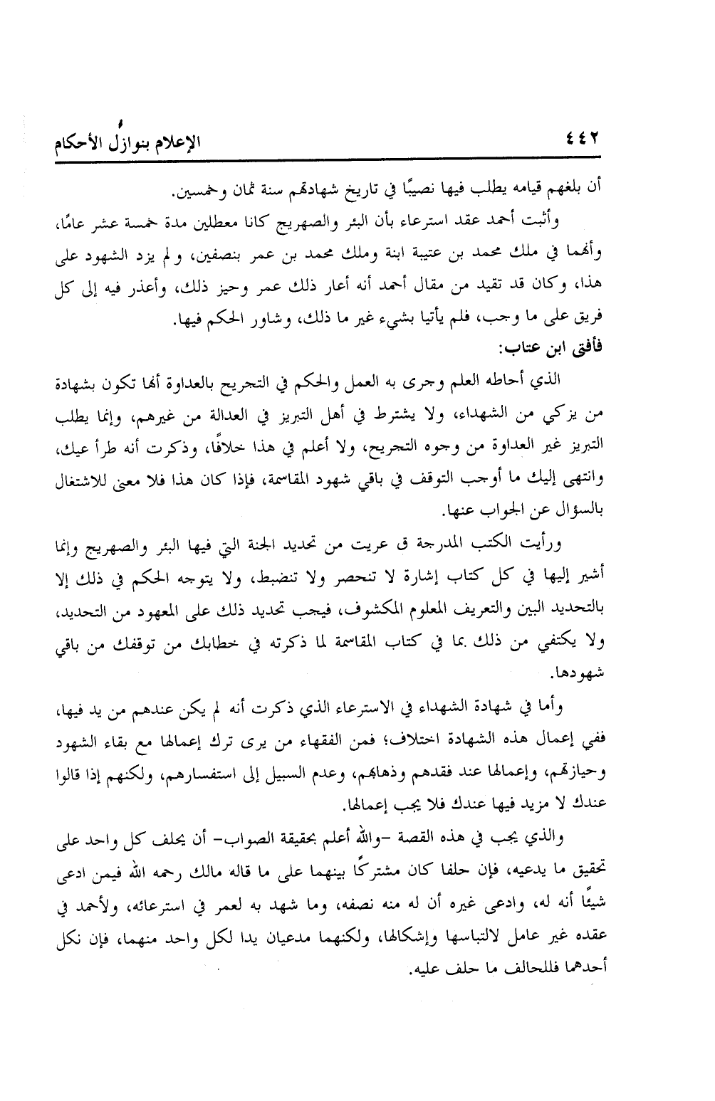 وأثبت أحمد عقد استرعاء بان البئر والصهريج كانا معطلين مدة خمسة عشر عامًا، وأنهما في ملك محمد بن عتيبة ابنة ومل محمد بن عمر بنصفين، ولم يزد الشهود على هذا، وكان قد تقيد من مقال أحمد أنه أعار ذلك عمر وحيز ذلك، وأعذر فيه إلى كل فريق على ما وجب، فلم يأتيا بشيء غير ما ذلك، وشاور الحكم فيها.