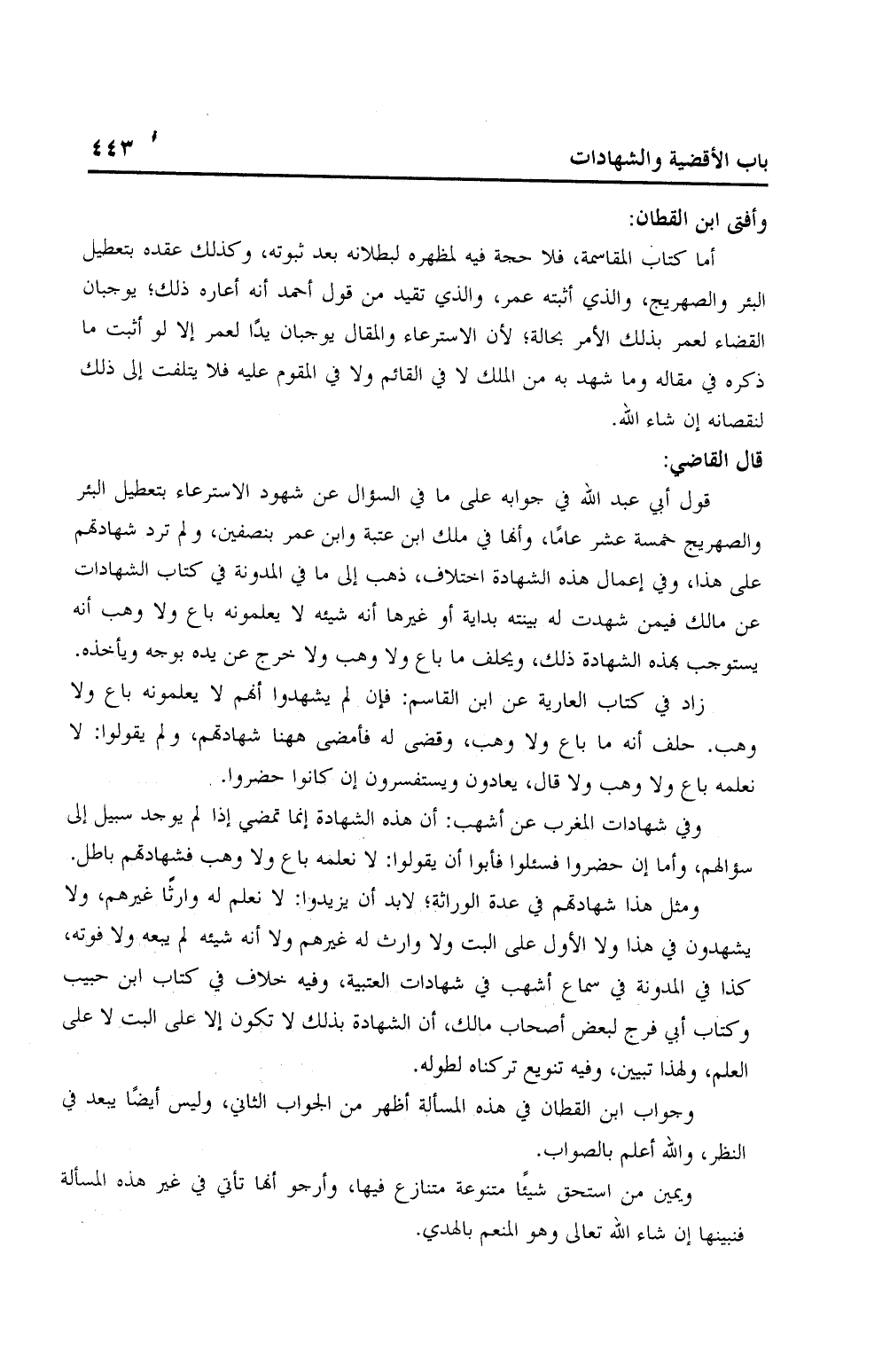 أما كتاب المقاسمة، فلا حجة فيه لمظهره لبطلانه بعد ثبوته، وكذلك عقده بتعطيل البئر والصهريج، والذي أثبته عمر، والذي تقيد من قول أحمد أنه أعاره ذلك؛ يوجبان القضاء لعمر بذلك الأمر حالة؛ لأن الاسترعاء والمقال يوجبان بدًا لعمر إلا لو أثبت ما ذكره في مقاله وما شهد به من الملك لا في القائم ولا في المقوم عليه فلا يتلفت إلى ذلك لنقصانه إن شاء الله.