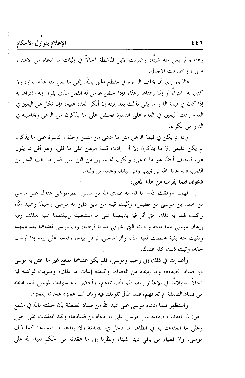 واستظهر فيما ادعاه موسى على عبد الله من فساد الصفقة بأن حلفته بالله في مقطع الحق: لما انعقدت صفقته على موسى على ما ادعاه من فسادها، ولقد انعقدت على الجواز وعلى ما انعقدت به في الظاهر ما دخل في الصفقة ولا بعدها ما يفسدها كما ذلك موسى، ولا قضاه من باقي دينه شيئًا، ونظرنا إلى ما عقدته من الحكم لعبد الله على