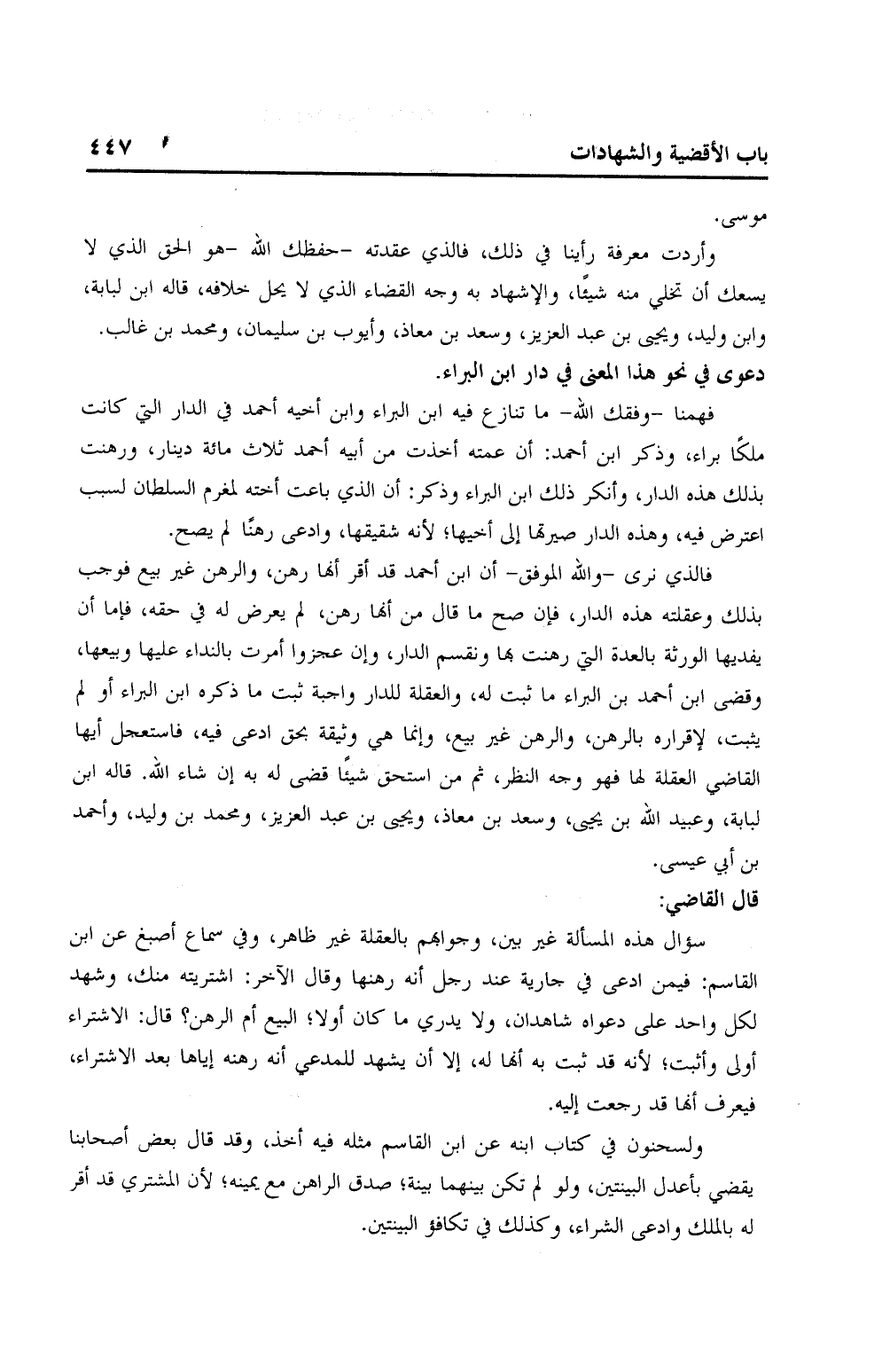 فالذي نرى – والله الموفق – أن ابن أحمد قد أقر أنها رهن، والرهن غير بيع فوجب بذلك وعقلته هذه الدار، فإن صح ما قال من أنها رهن، لم يعرض له في حقه، فإما أن يفديها الورثة بالعدة التي رهنت بها ونقسم الدار، وإن عجزوا أمرت بالنداء عليها وبيعها، وقضى ابن أحمد بن البراء ما ثبت له، والعقلة للدار واجبة ثبت ما ذكره ابن البراء أو لم يثبت، لإقراره بالرهن، والرهن غير بيع، وإنما هي وثيقة بحق ادعى فيه، فاستعجل أيها القاضي العقلة لها فهو وجه النظر، ثم من استحق شيئًا قضى له به إن شاء الله. قاله ابن لبابة، وعبيد الله بن يحيى، وسعد بن معاذ، ويحيى بن عبد العزيز، ومحمد بن وليد، وأحمد بن أبي عيسى.