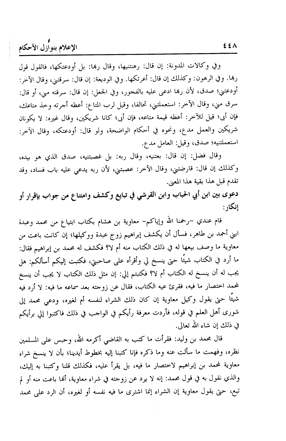 قال محمد بن وليد: فقرأت ما كتب به القاضي أكرمه الله، وحبس على المسلمين نظره، وفهمت ما سألت عنه وما ذكره فإنا كتبنا إليه بخطوط أيدينا؛ بأن لا ينسخ شراء معاوية لمحمد بن إبراهيم لاختصار ما فيه، بل يقرأ عليه، فكذلك قلنا وكتبنا به إليك، والذي نقول به في قول محمد: إنه لا يرد عن زوجته في شراء معاوية، أنها باعت منه أو لم تبع؛ حتى يقول معاوية إن الشراء إنما اشترى ما فيه نفسه أو لغيره، أن الرد على محمد
