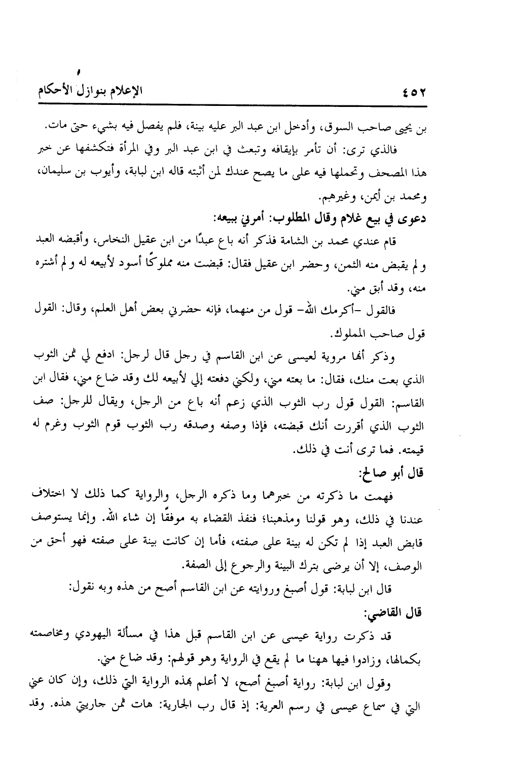فهمت ما ذكرته من خبرهما وما ذكره الرجل، والرواية كما ذلك لا اختلاف عندنا في ذلك، وهو قولنا ومذهبنا؛ فنفذ القضاء به موفقًا إن شاء الله. وإنما يستوصف قابض العبد إذا لم تكن له بينه على صفته، فأما إن كانت بينة على صفته فهو أحق من الوصف، إلا أن يرضى بترك البينة والرجوع إلى الصفة.