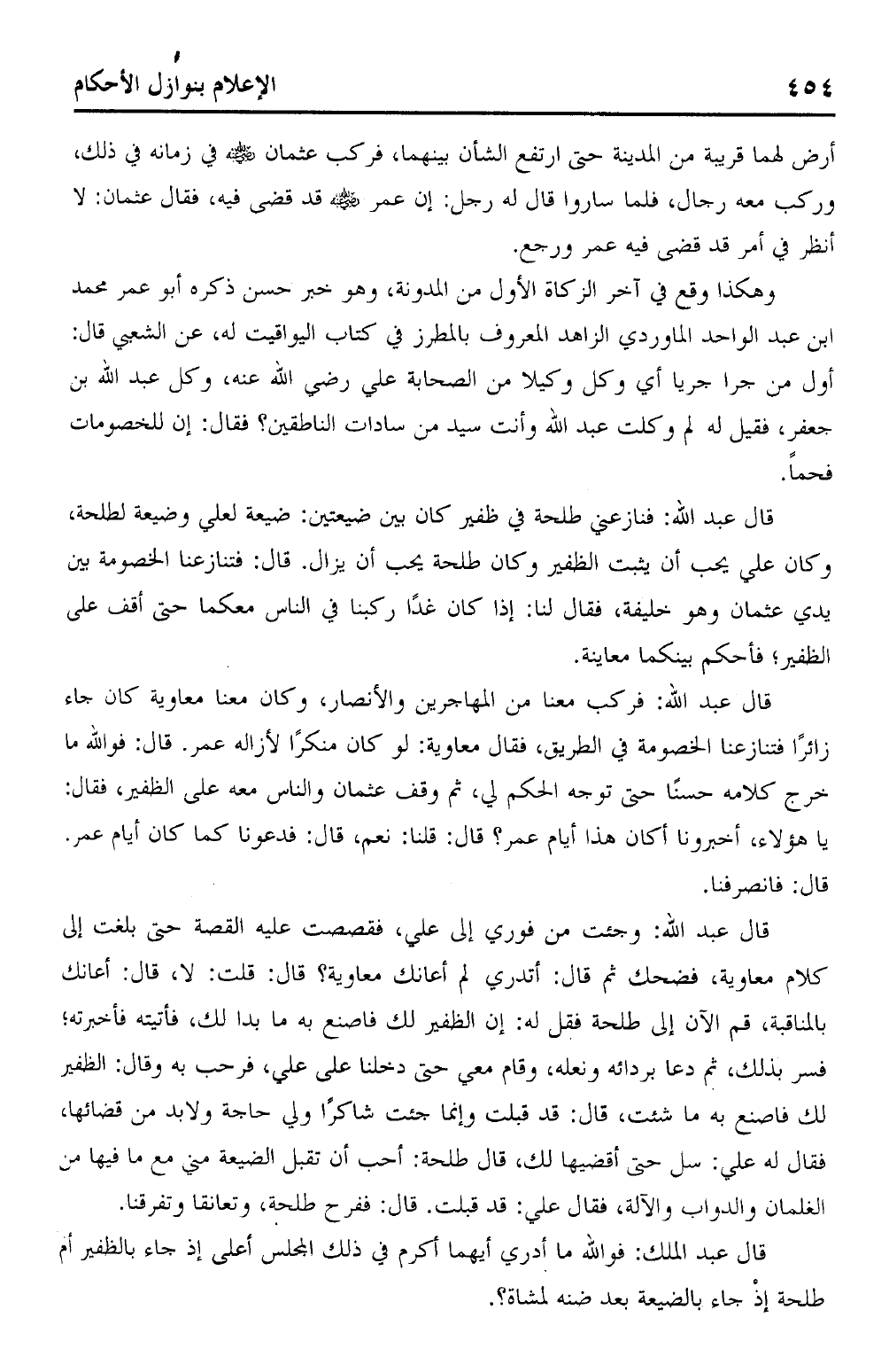 قال عبد الله: فنازعني طلحة في ظفير كان بين ضيعتين: ضيعة لعلي وضيعة لطلحة، وكان علي يحب أن يثبت الظفير وكان طلحة يحب أن يزال. قال: فتنازعنا الخصومة بين يدي عثمان وهو خيفة، فقال لنا: إذا كان عدًا ركبنا في الناس معكما حتى أقف على الظفيرا فأحكم بينكما معاينة.