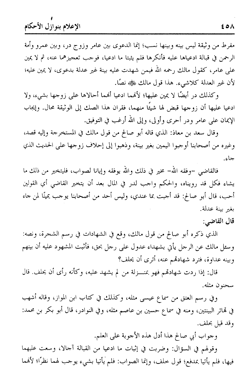 فالقاضي – وفقه الله – مخير في ذلك والله يوفقه وإيانا لصواب، فليتخير من ذلك ما يشاء فكل قد ورويناه، والحكم واجب لدر في المال بعد أن يتخير القاضي أي القولين أحب، قال أبو صالح: قد أجبت بما عندي، وليس أحد من أصحابنا يوجب يمينًا لمن جاء بغير بينة عدلة.