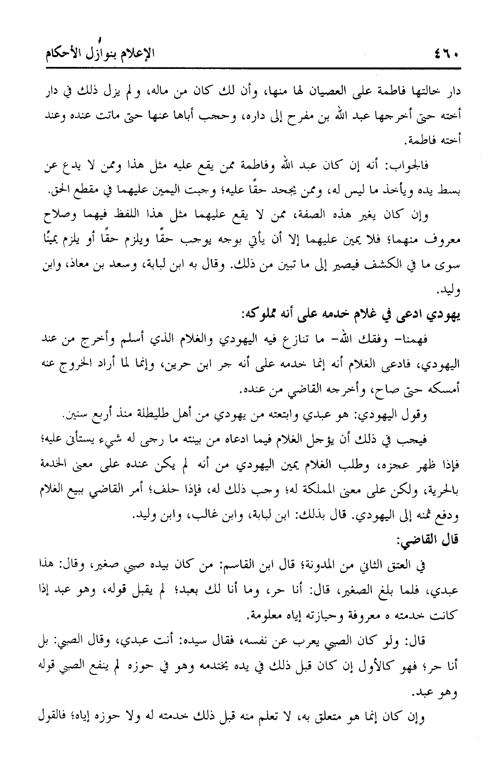 فهمنا – وفقك الله – ما تنازع فيه اليهودي والغلام الذي أسلم وأخرج من عند اليهودي فادعى العلام أنه إنما خدمه على أنه جر ابن حرين، وإنما لما أراد الخروج عنه أمسكه حتى صاح، وأخرجه القاضي من عنده.