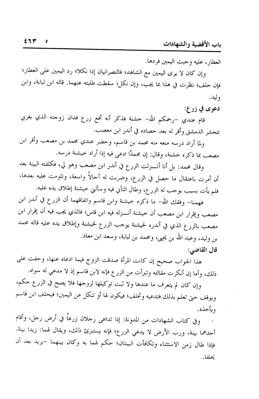 وقال محمد: بل أنا أنزلت الزرع في أندر ابن مصعب وهو لي، فكلفته البينة بعد أن أمرت باعتقال ما حصل في الزراع، وضربت له آجالاً واسعة، وتلومت عليه بعدها، قلم يأت بسبب يوجب له الزرع، وطال التأني فيه وسألني خيشنة إطلاق يده عليه.
