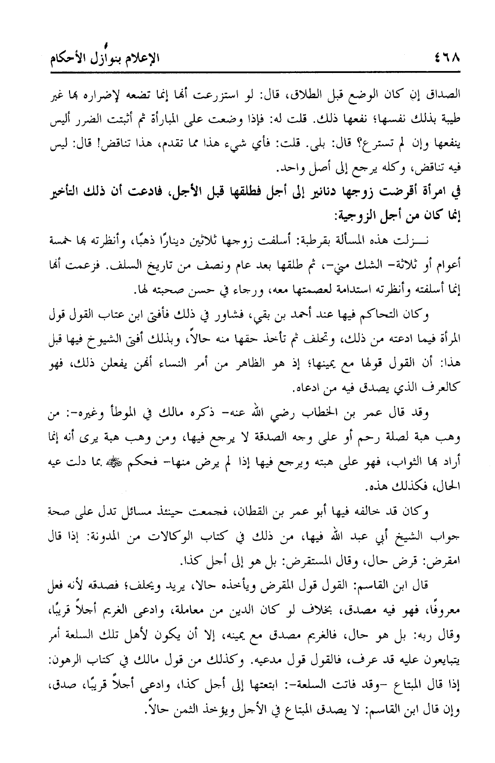 نزلت هذه المسألة بقرطبة: أسلفت زوجها ثلاثين دينارًا ذهبًا، وأنظرته بها خمسة أعوام أو ثلاثة – الشك مني -، ثم طلقها بعد عام ونصف من تاريخ السلف. فزعمت أنها إنما أسلفته وأنظرته استدامة لعصمتها معه، ورجاء في حسن صحبته لها.