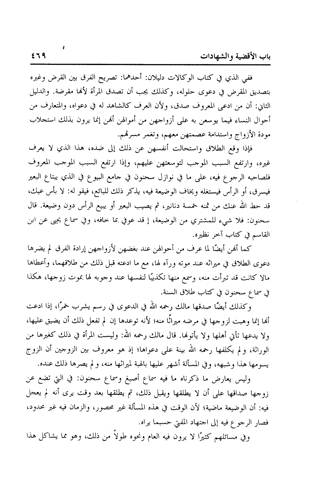 ففي الذي في كتاب الوكالات دليلان: أحدهما: تصريح الفرق بين القرض وغيره بتصديق المقرض في دعوى حلوله، وكذلك يجب أن تصدق المرأة لأنها مقرضة. والدليل الثاني: أن من ادعى المعروف صدق، ولأن العرف كالشاهد له في دعواه، والمتعارف من أحوال النساء فيما يوسعن به على أزواجهن من أموالهن أنهن إنما يرون بذلك استجلاب مودة الأزواج واستدامة عصمتهن معهم، وتغمر مسرتهم.