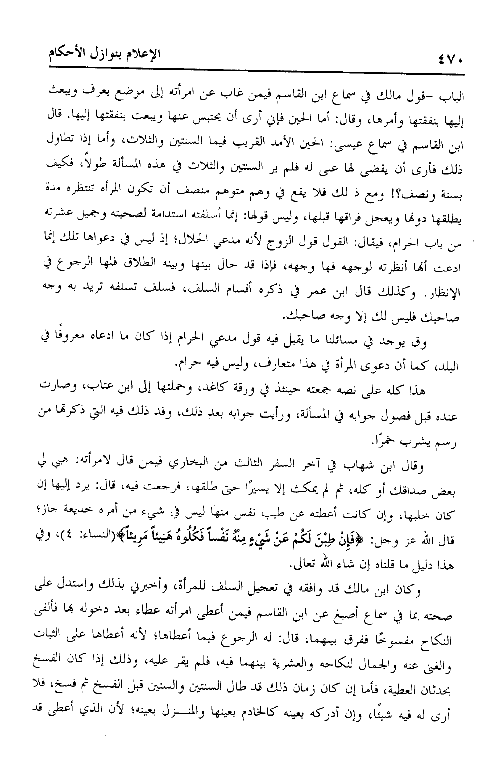 الباب – قول مالك في سماع ابن القاسم فيمن غاب عن امرأته إلى موضع يعرف ويبعث إليها بنفقتها وأمرها، وقال: أما الحين فإني أرى أن يحتبس عنها ويبعث بنفقتها إليها. قال ابن القاسم في مساع عيسى: الحين الأمد القريب فيما السنتين والثلاث، وأما إذا تطاول ذلك فأرى أن يقضي لها على له فلم ير السنتين والثلاث في هذه المسألة طولاً، فكيف بسنة ونص؟! ومع ذلك فلا يقع في وهم متوهم منصف أن تكون المرأة تنتظره مدة يطلقها دونها ويعجل فراقها قبلها، ويس قولها: إنما أسلفته استدامة لصحبته وجميل عشرته من باب الحرام، فيقال: القول قول الزوج لأنه مدعي الحلال؛ إذ ليس في دعواها تلك إنما ادعت أنها أنظرته لوجهه فها وجهه، فإذا قد حال بينها وبينه الطلاق فلها الرجوع في الإنطار. وكذل قال ابن عمر في ذكره أقسام السلف، فسلف تسلفه تريد به وجه صاحبك فليس لك إلا وجه صاحبك.
