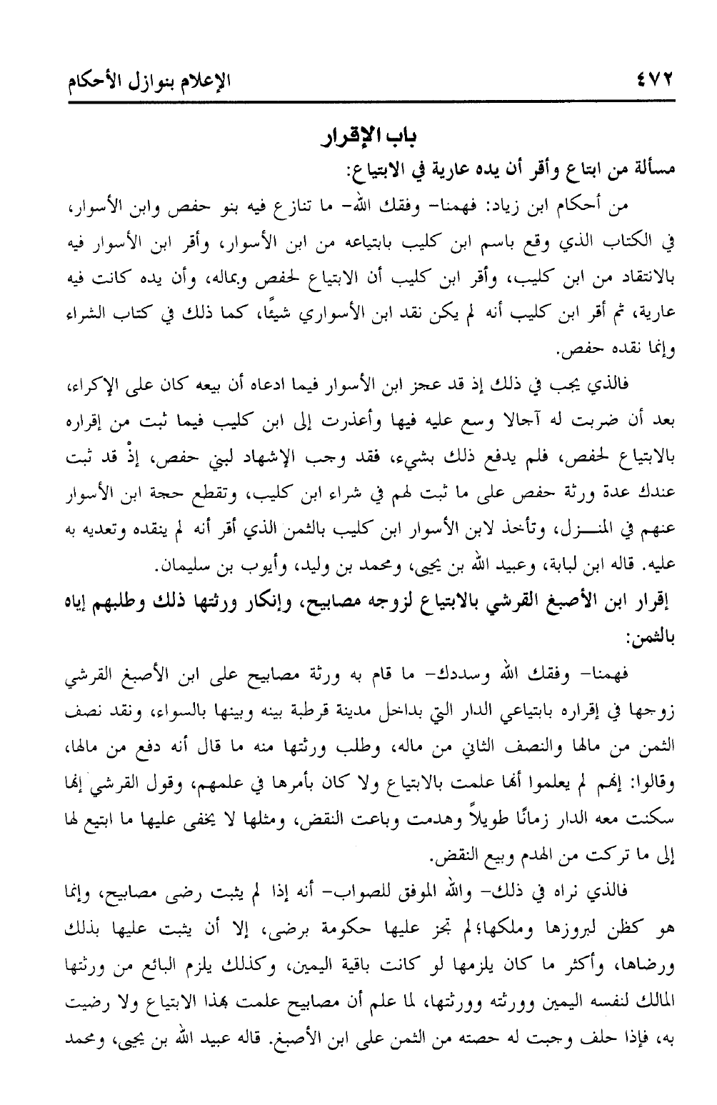 من أحكام ابن زياد: فهمنا - وفقك الله - ما تنازع فيه بنو حفص وابن الأسوار، في الكتاب الذي وقع باسم ابن كليب بابتياعه من ابن الأسوار، وأقر ابن الأسوار فيه بالانتقاد من ابن كليب، وأقر ابن كليب أن الابتياع لحفص وبماله، وأن يده كانت فيه عارية، ثم أقر ابن كليب أنه لم يكن نقد ابن الأسواري شيئًا، كما ذلك في كتاب الشراء وإنما نقده حفص.