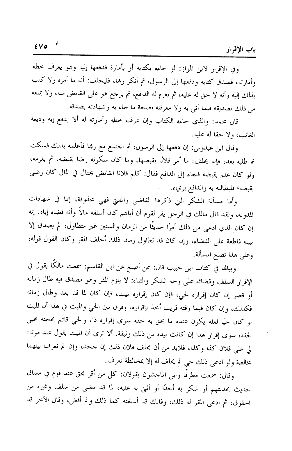 وأما مسألة الشكر التي ذكرها القاضي والمفتي فهي محذوفة، إنما في شهادات المدونة، ولقد قال مالك في الرجل يقر لقوم أن أباهم كان أسلفه مالاً وأنه قضاه إياه: إنه إن كان الذي ادعى من ذلك أمرًا حديثًا من الزمان والسنين غير متطاول، لم يصدق إلا ببينة قاطعة على القضاء، وإن كان قد تطاول زمان ذلك أحلف المقر وكان القول قوله، وعلى هذا تصح المسألة.