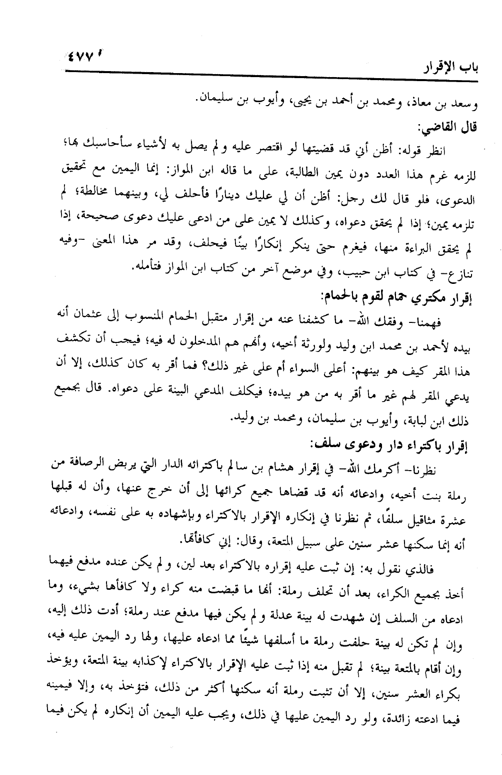 فهمنا – وفقك الله – ما كشفنا عنه من إقرار متقبل الحمام المنسوب إلى عثمان أنه بيده لأحمد بن محمد ابن وليد ولورثة أخيه، وأنهم هم المدخلون له فيه؛ فيجب أن تكشف هذا المقر كيف هو بينهم: أعلى السواء أم على غير ذلك؟ فما أقر به كان كذلك، إلا أن يدعي المقر لهم غير ما أقر به من هو بيده؛ فيكلف المدعي البينة على دعواه. قال بجميع ذلك ابن لبابة، وأيوب بن سليمان، ومحمد بن وليد.
