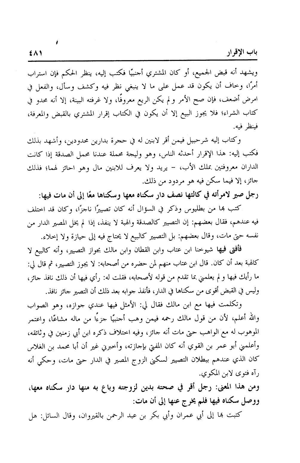 وتكلمت فيها مع ابن مالك فقال لي: الأمثل فيها عندي جوازه، وهو الصواب والله أعلم، لأن من قول مالك رحمه فيمن وهب أجنبيًا جزءًا من ماله مشاعًا، واعتمر الموهوب له مع الواهب حتى مات أنه جائز، وفيه اختلاف ذكره ابن ابي زمنين في وثائقه، وأعلمني أبو عمر بن القوي أنه كان المفتي بإجازته، وأخبرني غير أن أبا محمد بن الغلاس كان الذي عندهم ببطلان التصيير لسكنى الزوج المصير في الدار حتى مات، وحكي أنه رآه فتوى لابن المكوي.