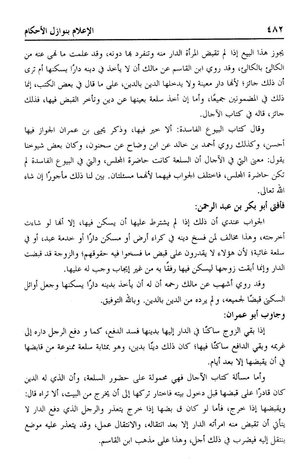 الجواب عندي أن ذلك إذا لم يشترط عليها أن يسكن فيها، إلا أنها لو شاءت أخرجته، وهذا مخالف لمن فسخ دينه في كراء أرض أو مسكن دائرًا أو خدمة عبد، أو في سلعة غائبة؛ لأن هؤلاء لا يقدرون على قبض ما فسخوا فيه حقوقهم؛ والزوجة قد قبضت الدار وإنما أبقت زوجها ليسكن فيها رفقًا به من غير إيجاب وجب له عليها.