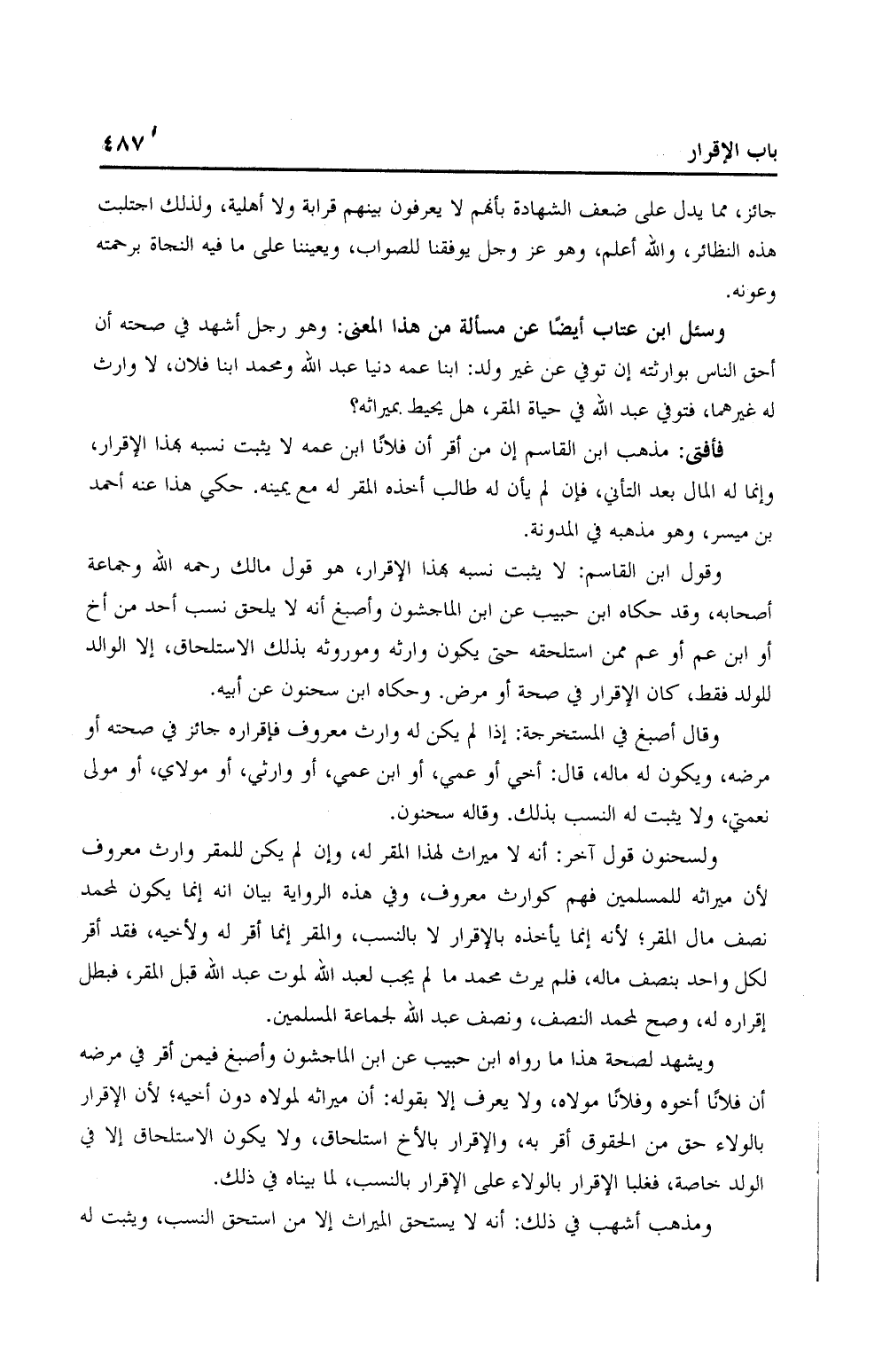 وقول ابن القاسم: لا يثبت نسبه بهذا الإقرار، هو قول مالك رحمه الله وجماعة أصحابه، وقد حكاه ابن حبيب عن ابن الماجشون وأصبغ أنه لا يلحق نسب أحد من أخ أو ابن عم أو عم ممن استلحقه حتى يكون وارثه وموروثه بذل الاستلحاق، إلا الوالد للولد فقط، كان الإقرار في صحة أو مرض. وحكاه ابن سحنون عن أبيه.