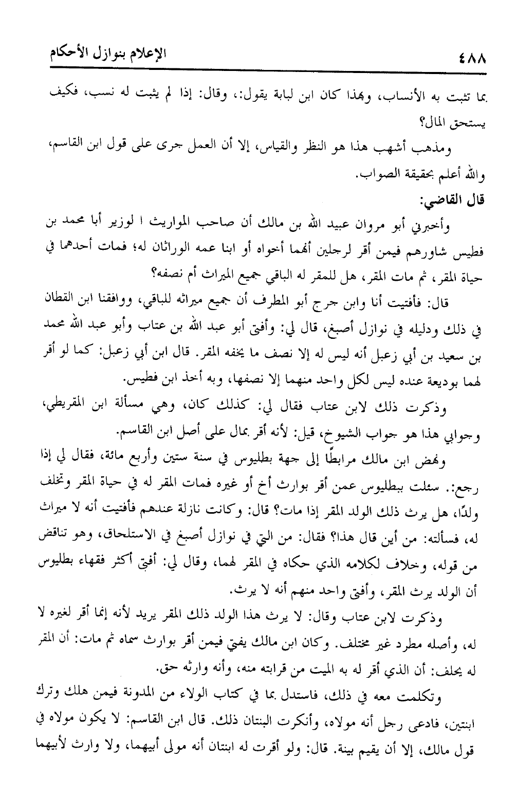 ونهض ابن مالك مرابطًا إلى جهة بطليوس في سنة ستين وأربع مائة، فقال لي إذا رجع:. سئلت ببطليوس عمن أقر بوارث أخ أو غيره فمات المقر له في حياة المقر وتخلف ولدًا هل يرث ذلك الولد المقر إذا مات؟ قال: وكانت نازلة عندهم فأفتيت أنه لا ميراث له، فسألته: من أين قال هذا؟ فقال: من التي في نوازل أصبغ في الاستلحاق، وهو تناقض من قوله، وخلاف لكلامه الذي حكاه في المقر لهما، وقال لي: أفتي أكثر فقهاء بطليوس أن الولد يرث المقر، وأفتى واحد منهم أنه لا يرث.