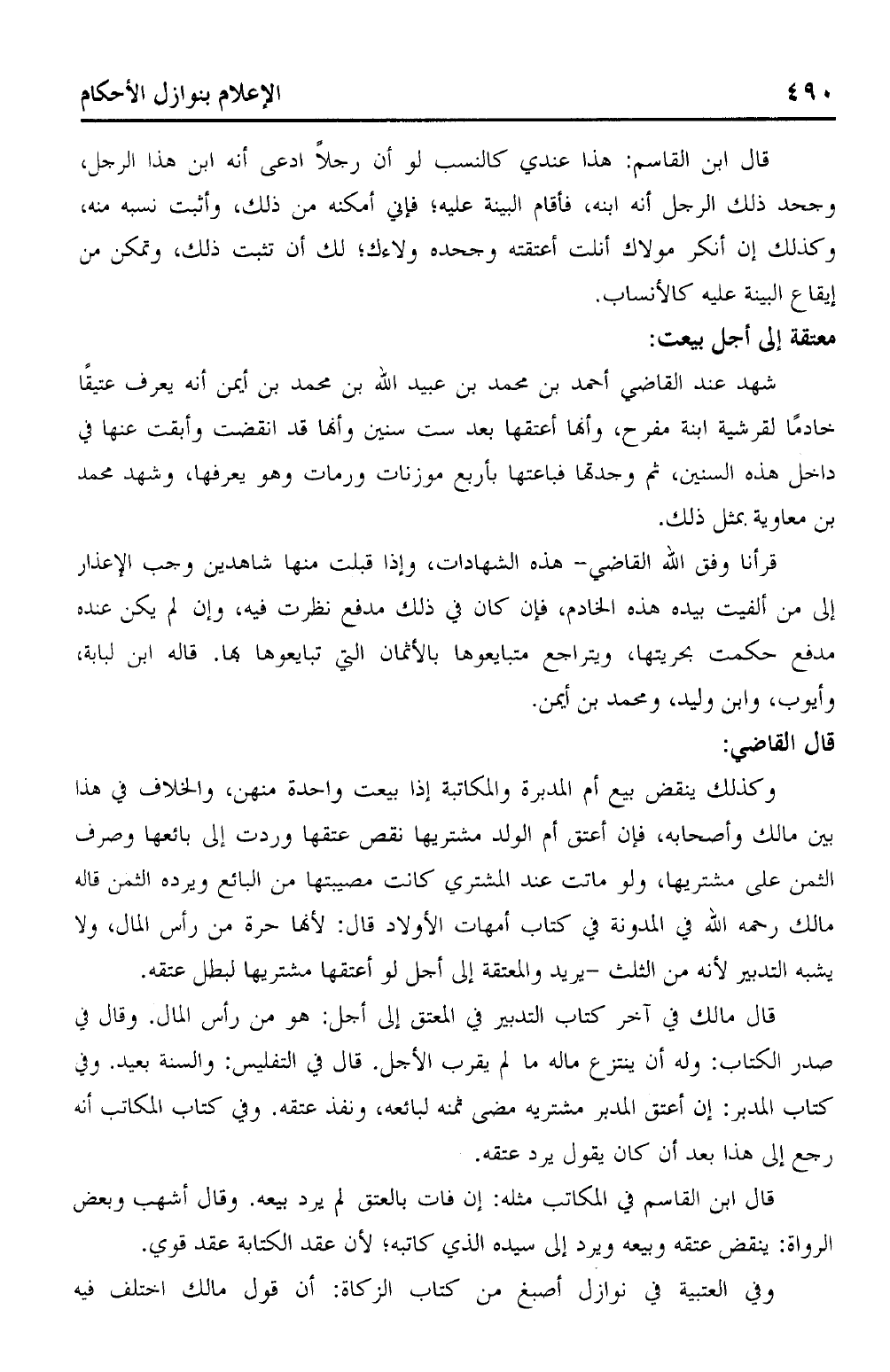 شهد عند القاضي أحمد بن محمد بن عبيد الله بن محمد بن أيمن أنه يعرف عتيقًا خادمًا لقرشية ابنة مفرح، وأنها أعتقها بعد ست سنين وأنها قد انقضت وأبقت عنها في داخل هذه السنين، ثم وجدتها فباعتها بأربع موزنات ورمات وهو يعرفها، وشهد محمد بن معاوية بمثل ذلك.