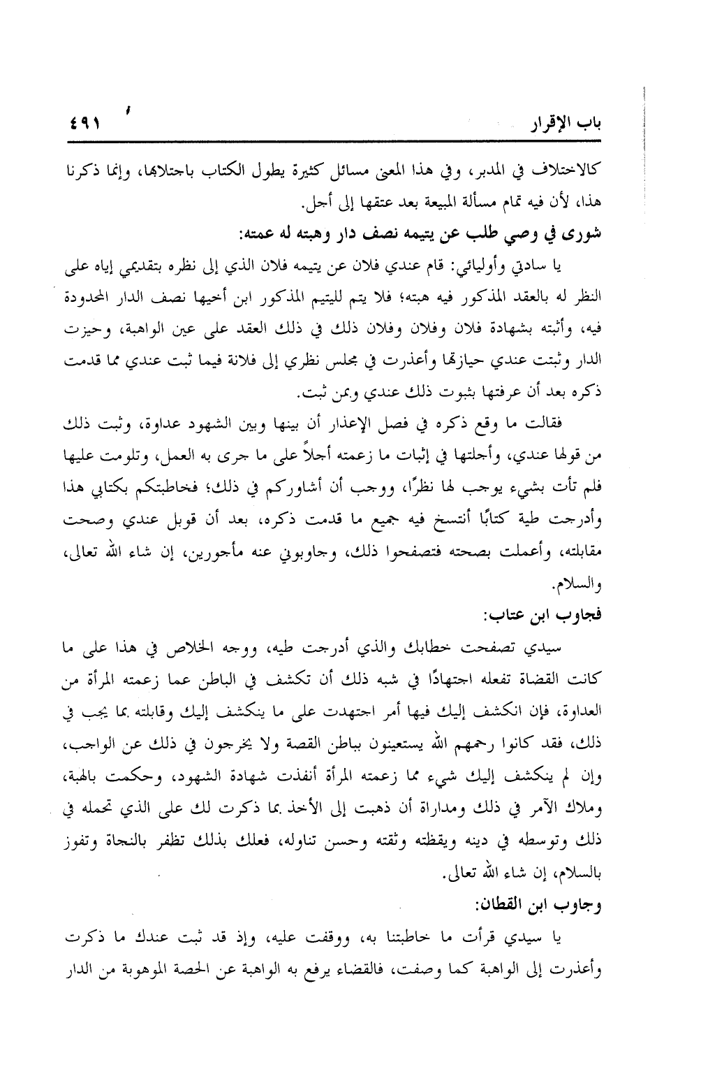 يا سيدي قرأت ما خاطبتنا به، ووقفت عليه، وإذ قد ثبت عندك ما ذكرت وأعذرت إلى الواهبة كما وصفت، فالقضاء يرفع به الواهبة عن الحصة الموهوبة من الدار
